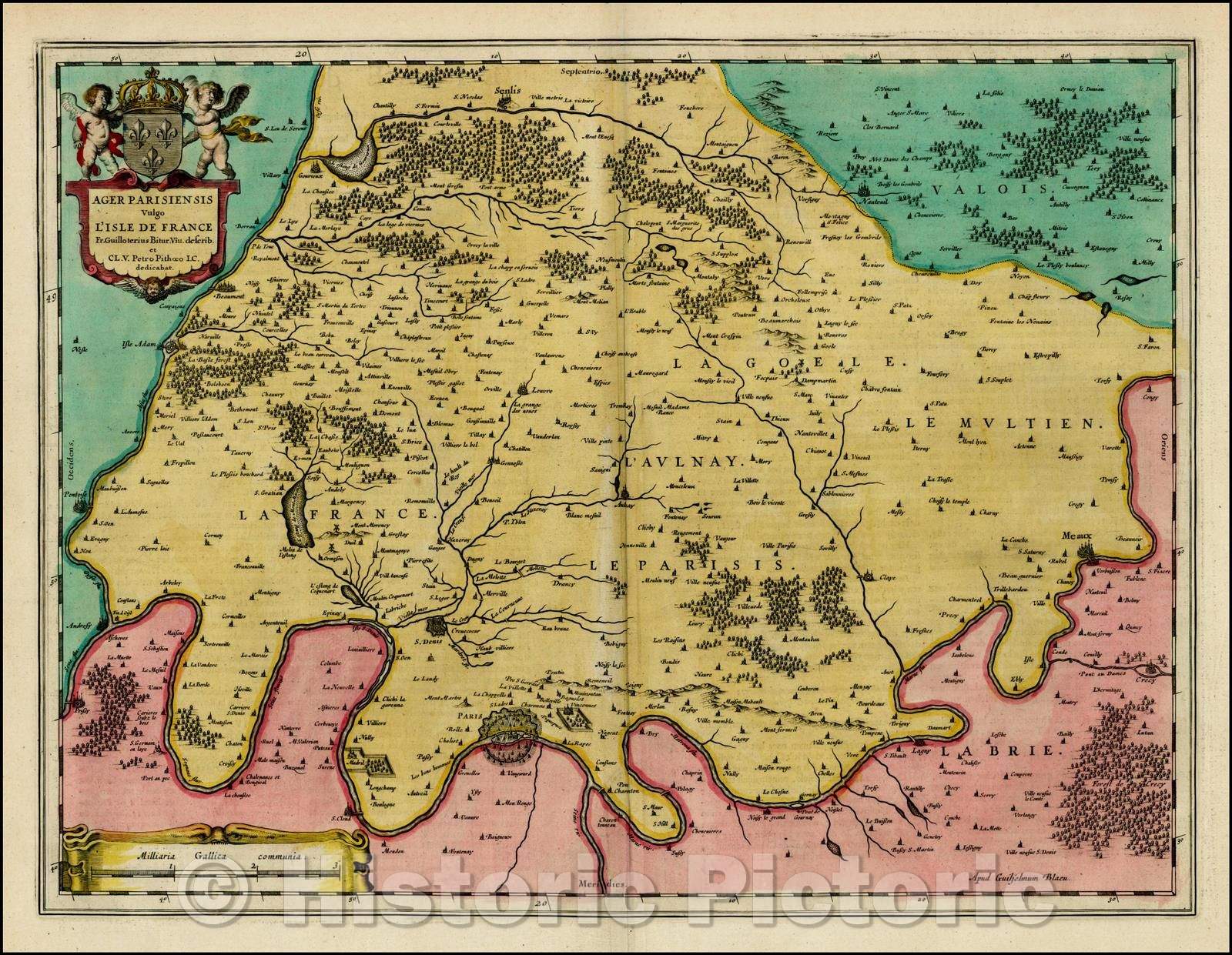 • .Historic Map - Ager Pariiensis vulgo L'Isle De France/Map of Isle De France, including a large Plan of Paris, 1642, Willem Janszoon Blaeu - Vintage Wall Art