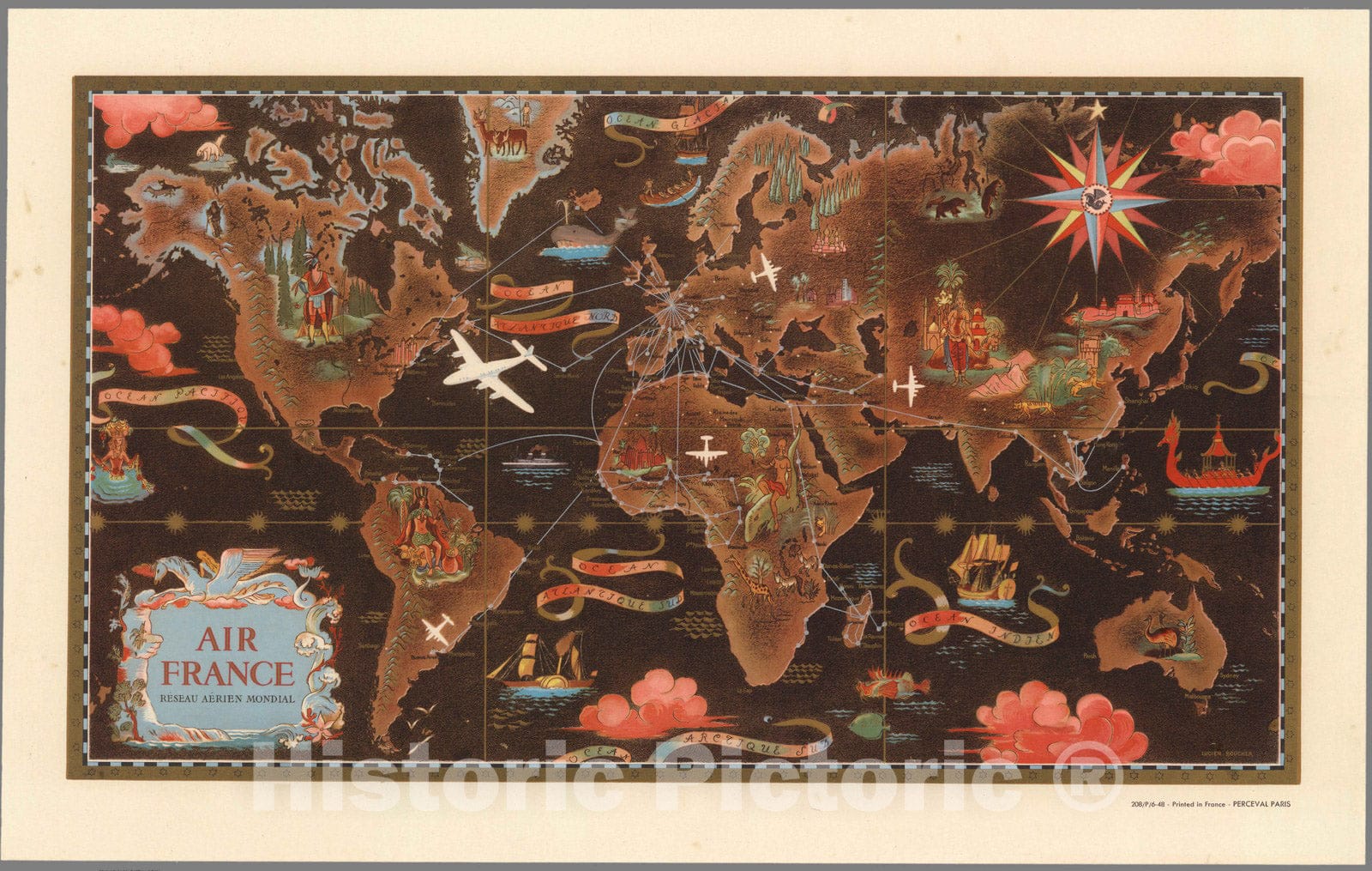 Historic Map : Air France, Air France, Reseau Aerien Mondial. 208/P/6-48 Printed in France. Perceval Paris. - Vintage Wall Art
