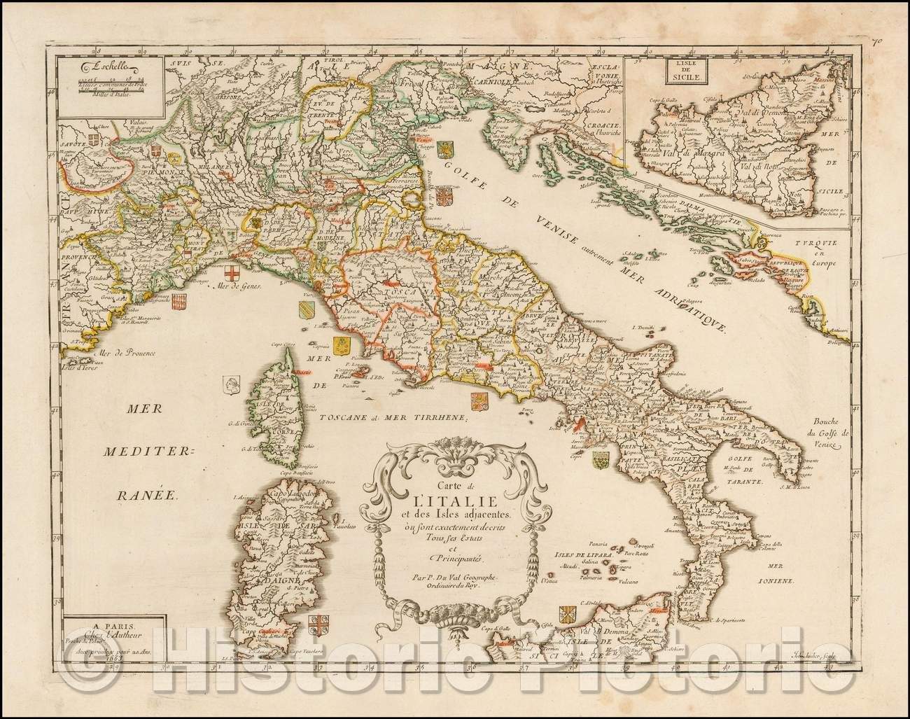 Historic Map - Carte de L'Italie et des Isles adjacentes ou sont exactement decrits/Map of Italy, published in Paris by Pierre Du Val in 1663, 1663 - Vintage Wall Art