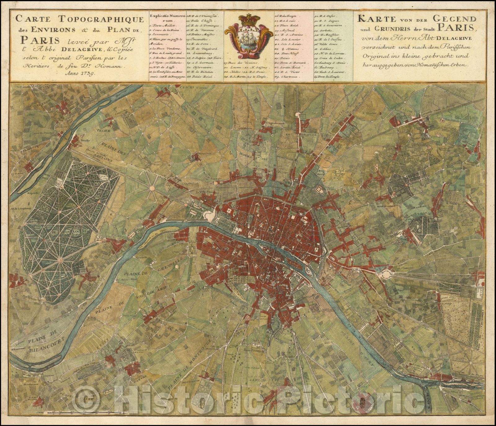 Historic Map - Carte Topographique des Environs & du Plan de Paris levee par Mr. l'Abee Delarive, 1739, Homann Heirs - Vintage Wall Art