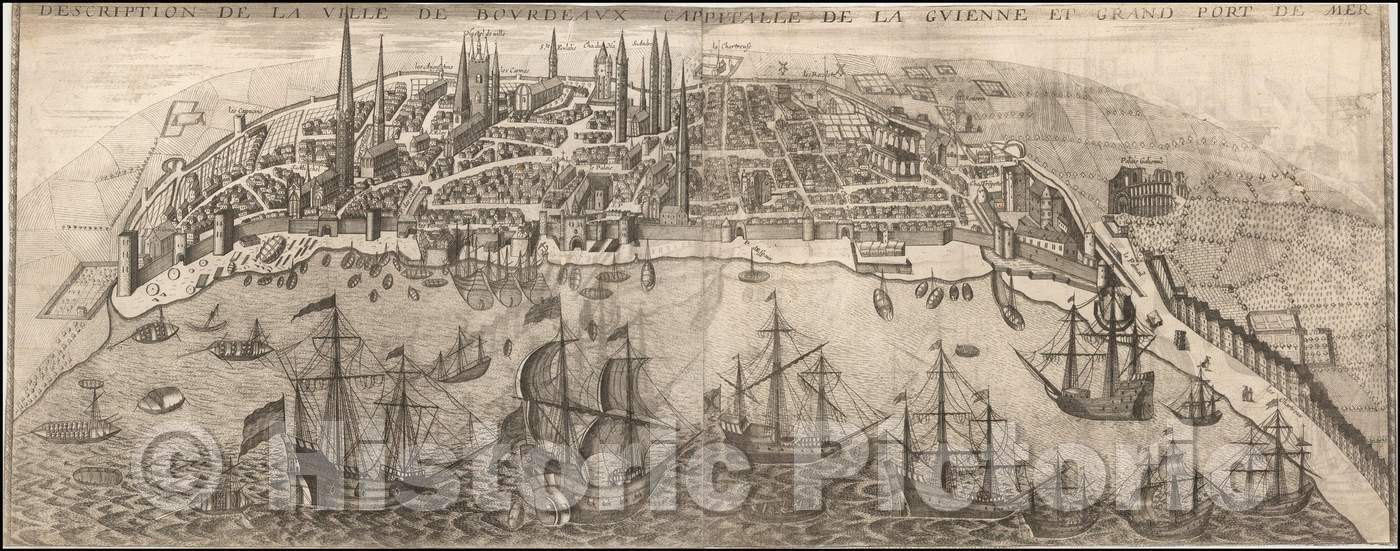 Historic Map - Description De La Ville De Bourdeaux Cappitalle De La Guienne Et Grand Port De Mer/View of Bordeaux, published in Paris by Jean BoisSeau, 1640 - Vintage Wall Art