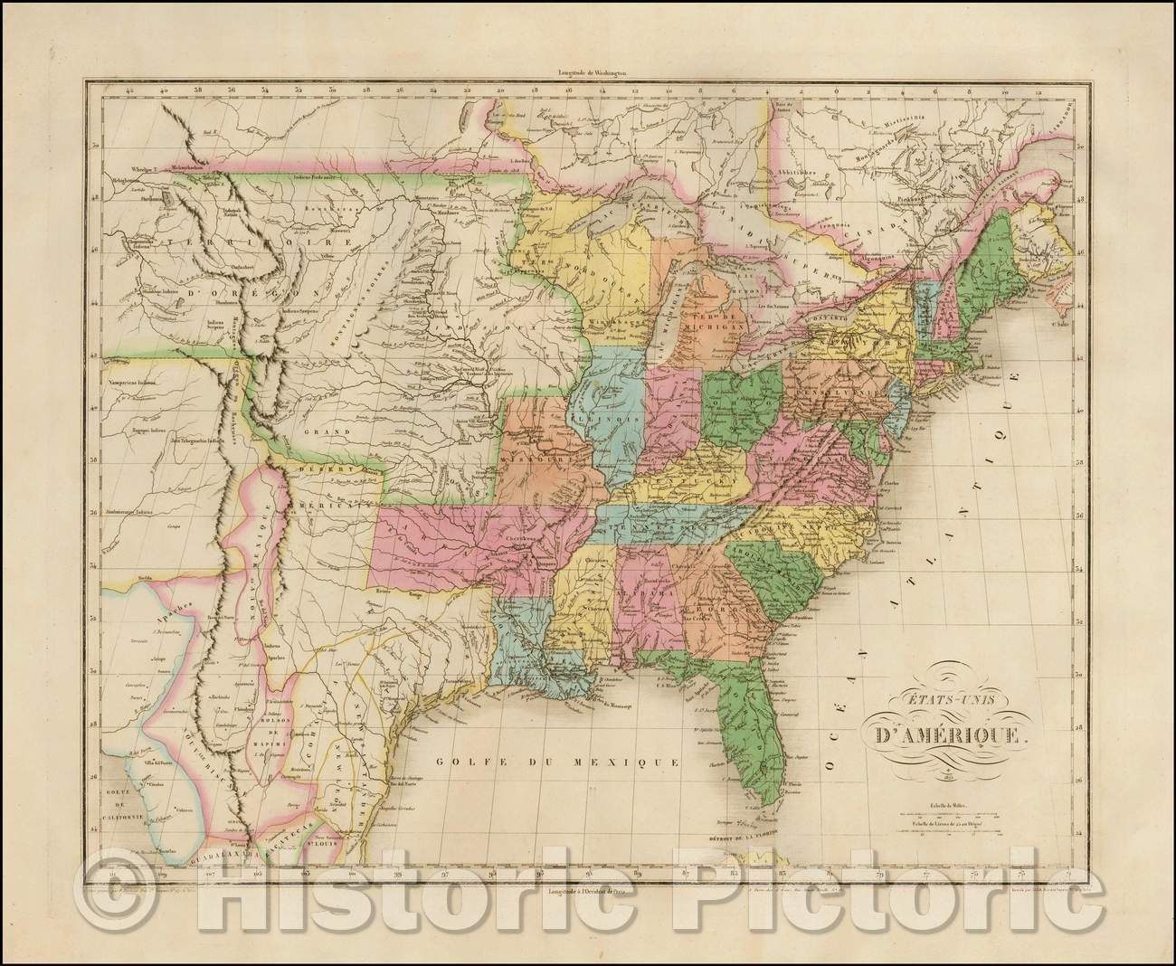 • .Historic Map - Etats-Unis d'Amerique/Map of the United States, published in Paris by Taride, 1825, Jean Alexandre Buchon - Vintage Wall Art