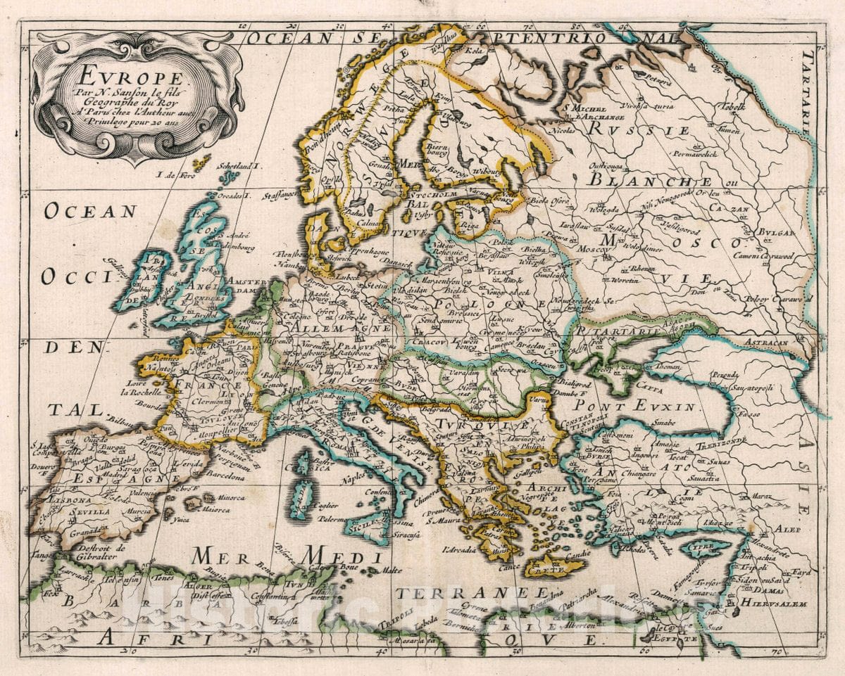 • .Historic Map : Evrope. Par N. Sanson le fils. Geographe du Roy. A Paris Chez l'Autheur avec Privilege Pour 20 ans, 1648 Atlas - Vintage Wall Art