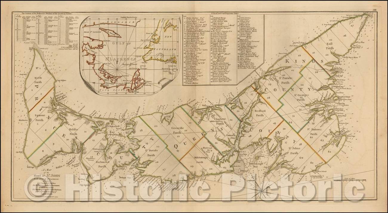Historic Map - Island of St. John In the Gulf of St. Laurence Divided Into Counties & Parishes And the Lots as granted, 1775, Samuel Holland - Vintage Wall Art