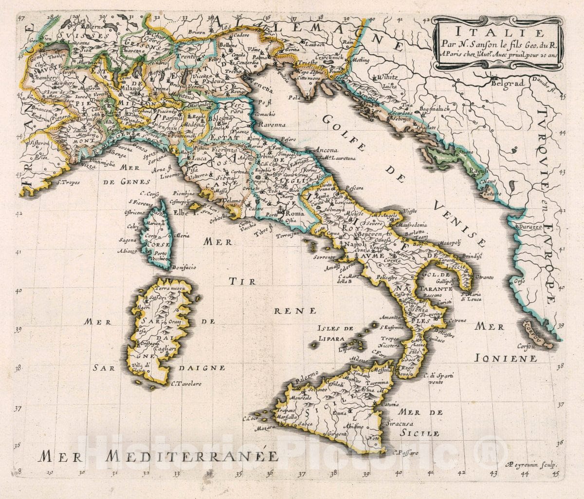 Historic Map : Italy, , Europe Italie. Par N. Sanson le fils Geo. du R. A Paris Chez l'autheur avec Privilege Pour 20 ans. A. Peyrounin sculp, 1648 Atlas , Vintage Wall Art