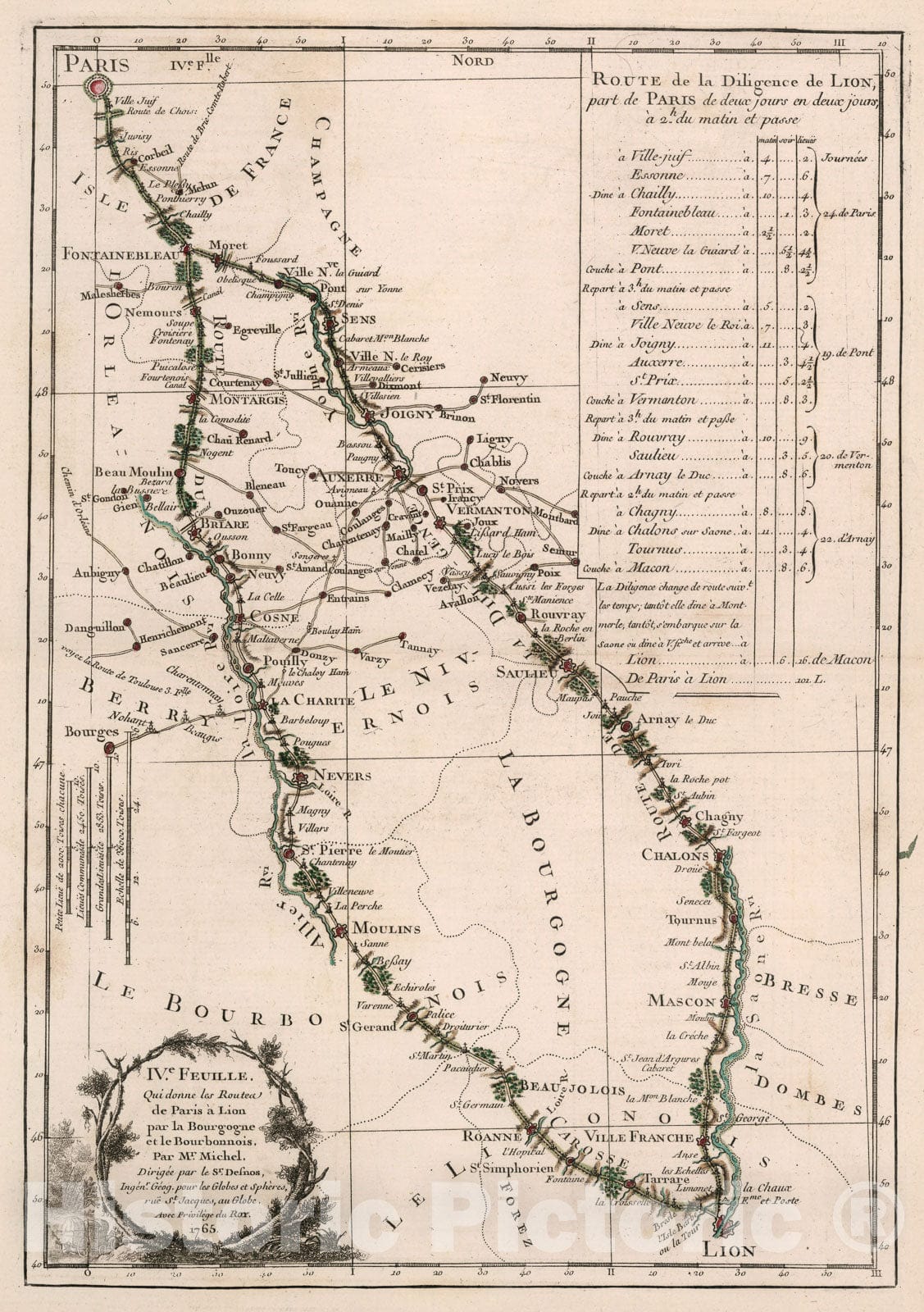 Historic Map : IVe. Feuille qui donne les routes de Paris a Lion, 1765, Vintage Wall Decor