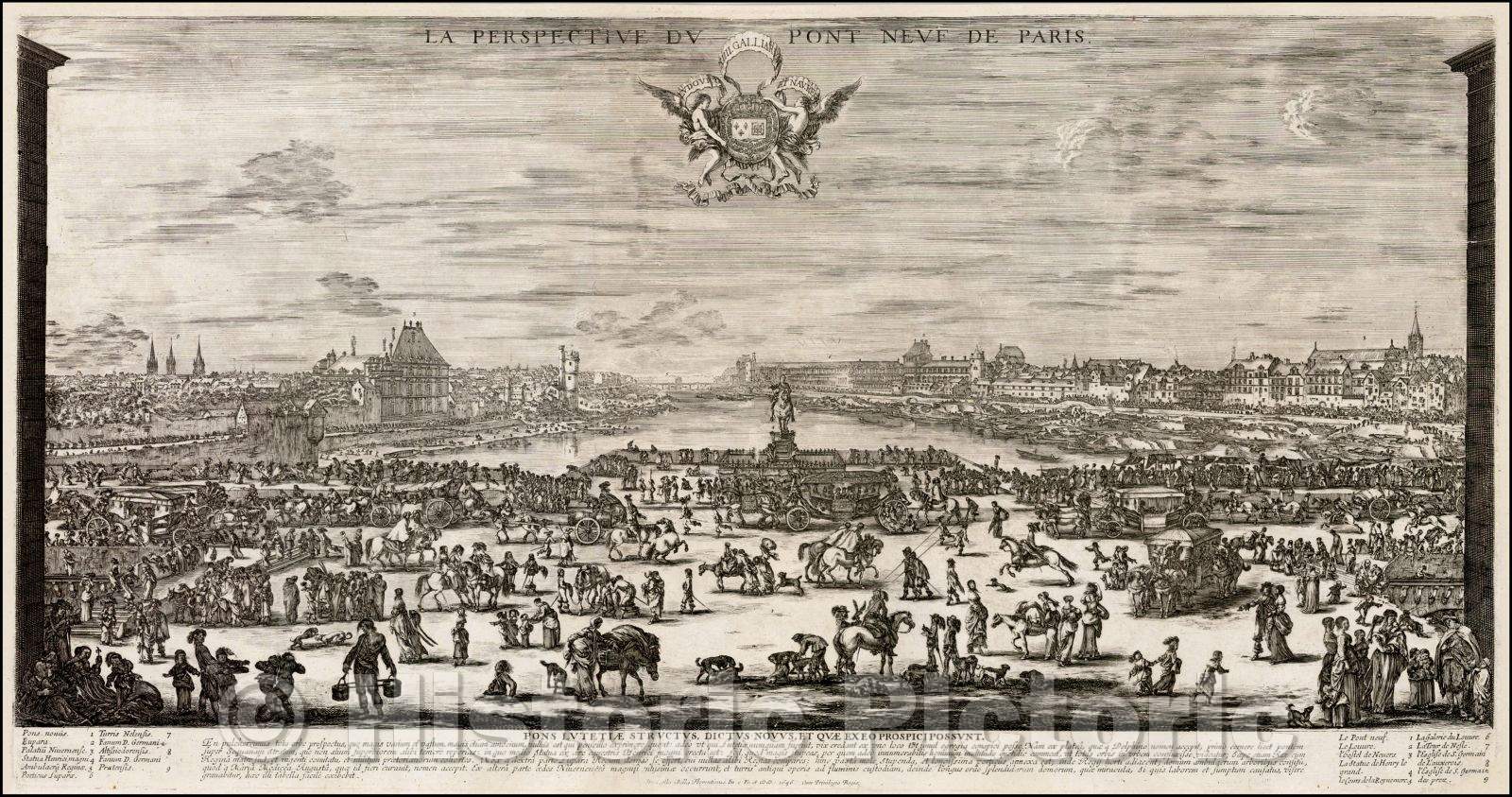 • .Historic Map - La Perspective Du Pont Neuf De Paris/View of Paris, looking up the Seine River, 1646, Stefano Della Bella - Vintage Wall Art