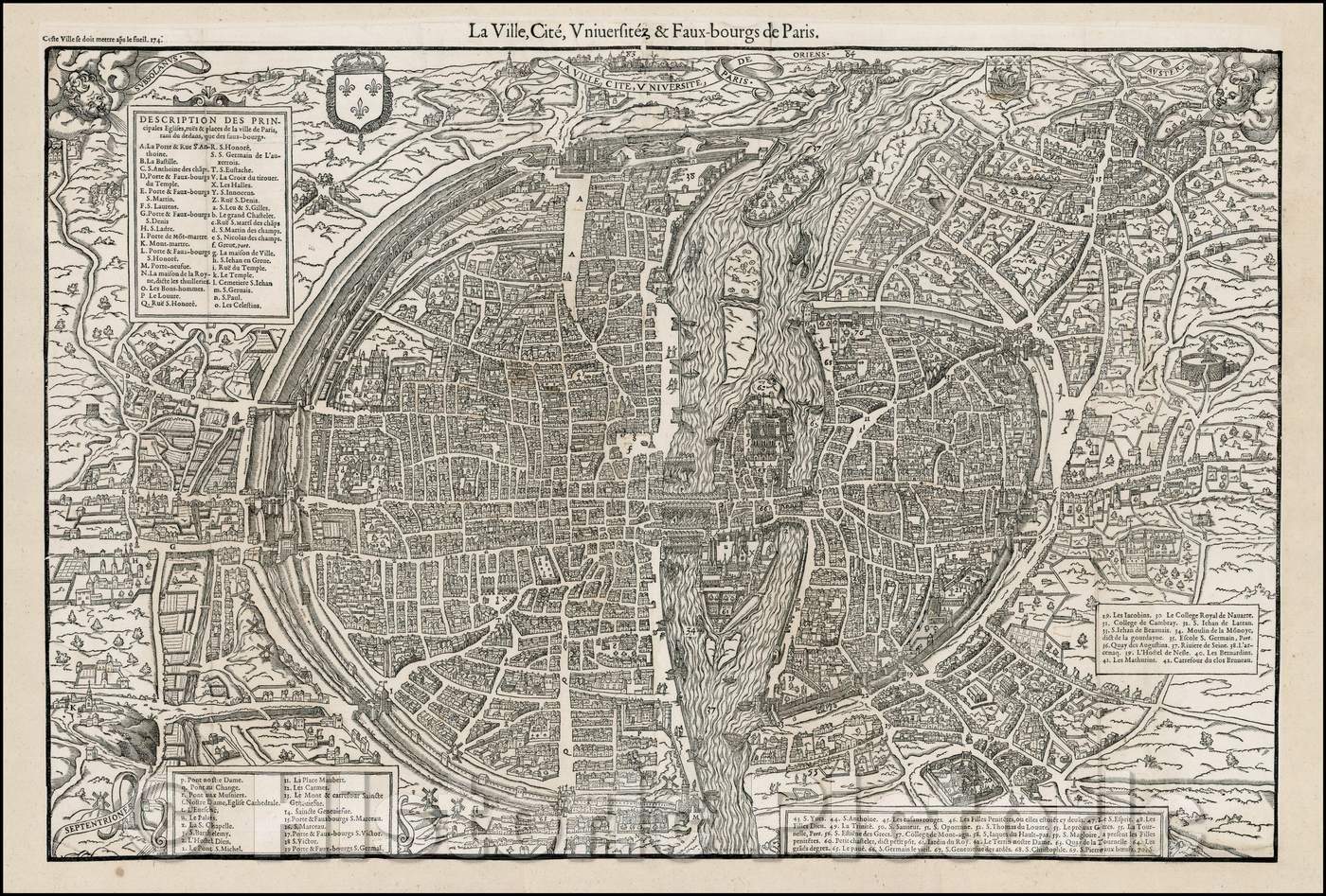 Historic Map - La Ville, Cite, Universite, Faux-Bourgs de Paris :: Plan of Paris, from De Belleforest's French edition of Sebastian Munster's Cosmographia, 1575 - Vintage Wall Art