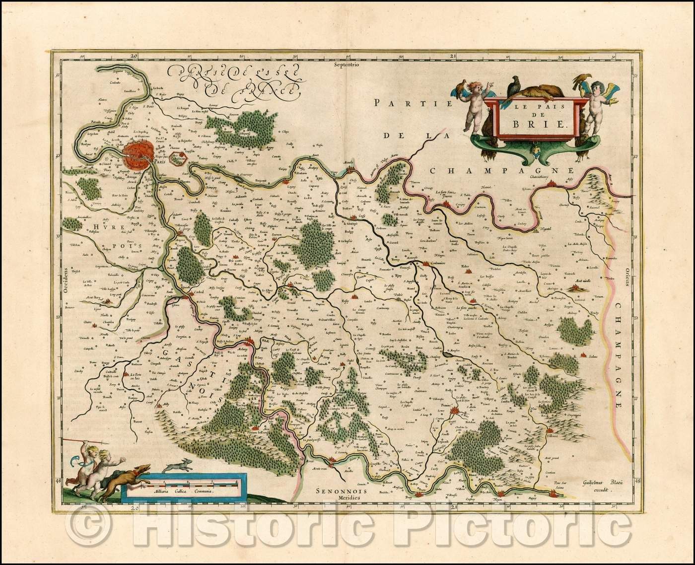 • .Historic Map - Le Pais De Brie/Blaeu's Map of the Brie Region, including Paris.< / p>, 1640, Willem Janszoon Blaeu - Vintage Wall Art