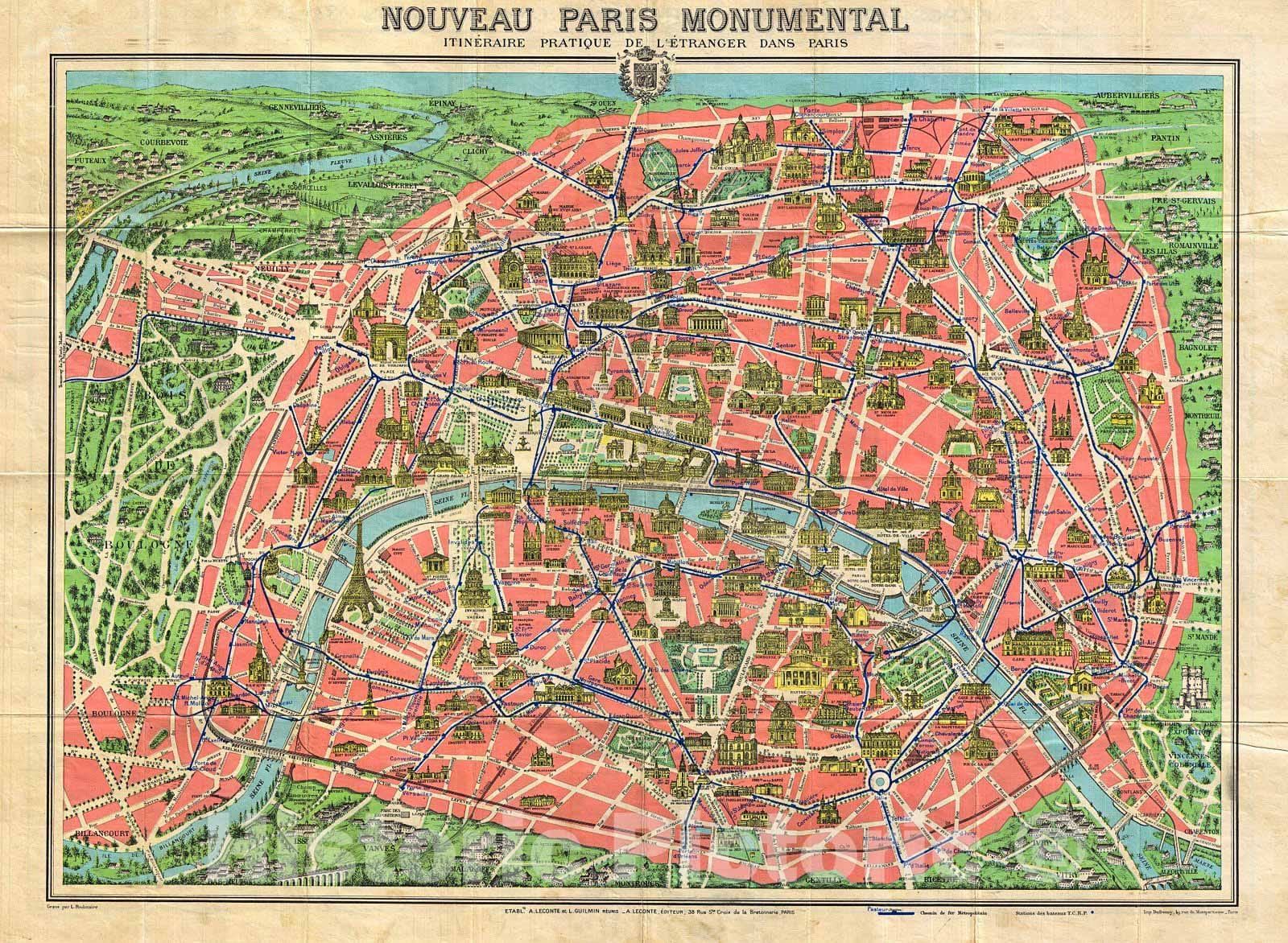This is an extremely attractive 1931 tourist pocket map of Paris, France. Covers the old walled city of Paris and the immediate vicinity. Drawn in a lavish art deco style with important buildings are shown in profile, including the Eiffel Tower, the Arc de Triomphe, Sacre-Coeur, the Pantheon, and others. Shows both the train and Metro lines throughout the city. This map was issued in various editions from, roughly 1900 to 1937. This example is exceptional in that it was issued in 1931, the year Paris hosted its International Colonial Exposition, a map of which appears of the verso. This incredible event, which was held in the Bois de Vincennes, lasted six months and drew nearly 33 million visitors. It was intended to showcase the riches and diversity of France's colonial possessions and included, among other wonders, a human zoo. Attached to original paper binder on the Exposition side of the map. Engraved by L. Poulmarie and printed by Gaston Maillet. Published by A. Leconte and L. Guilmin, of 38 Rue St. Croix de la Bretonnerie, Paris. The photo above shows both the front and back of a single sheet.
