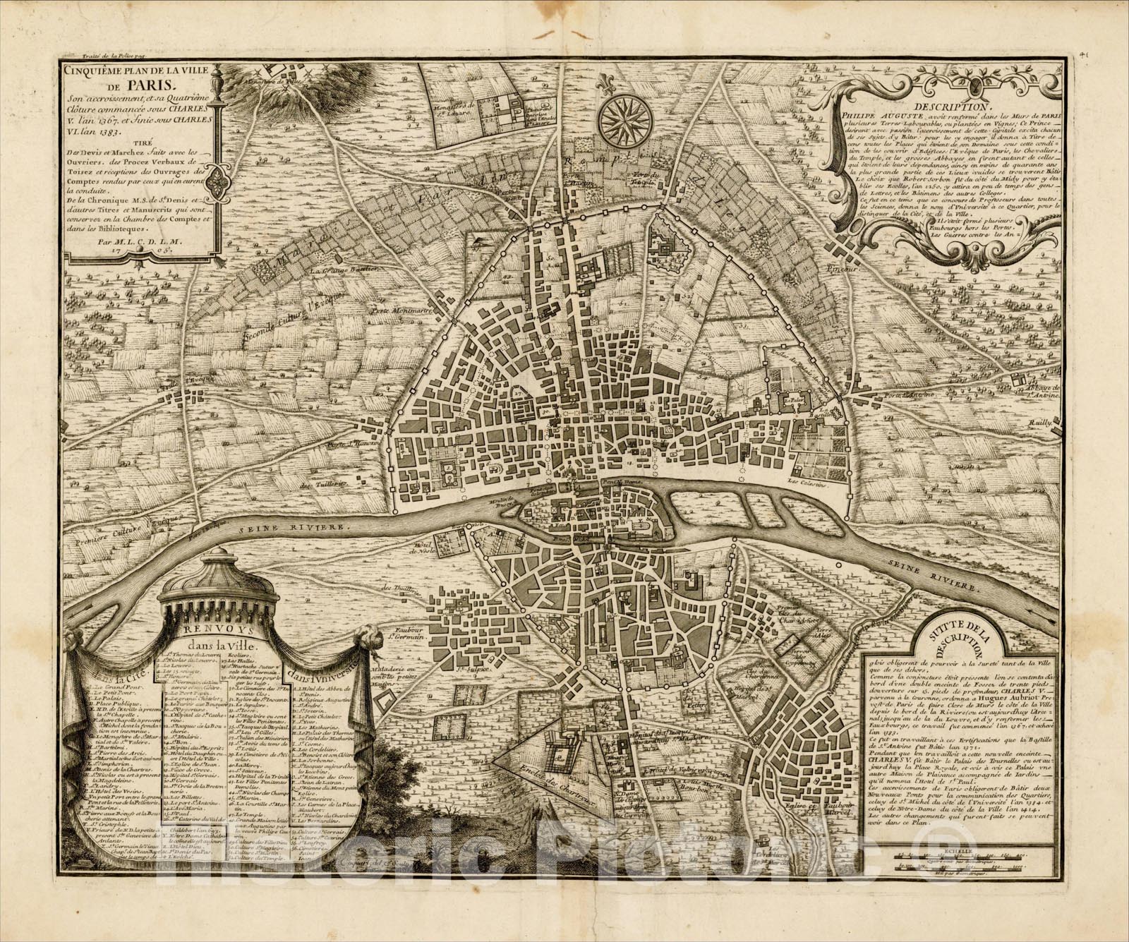 • .Historic Map : [Medieval Paris -- Charles V & VI] Cinquieme Plan de la Ville de Paris, 1705, Nicolas Delamare, Vintage Wall Art