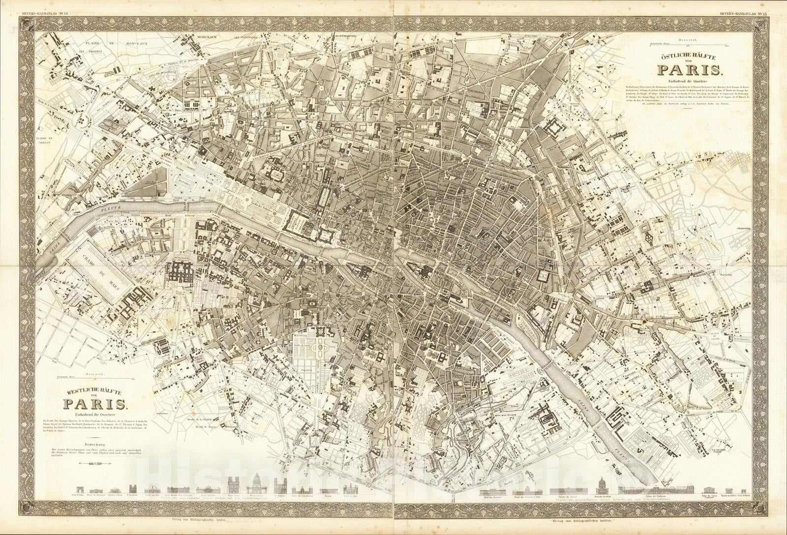 Historic Map : Ostliche Halfte von Paris, Westliche Halfte von Paris, 1845, Joseph Meyer, Vintage Wall Art