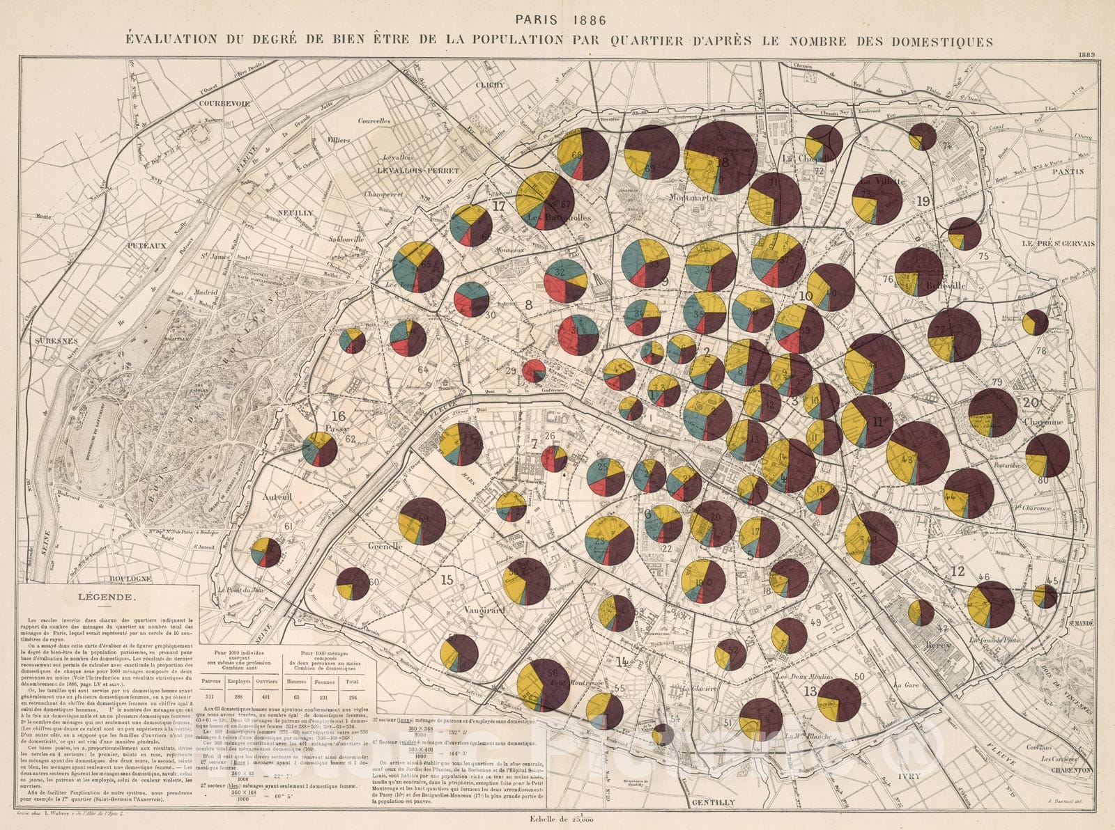 • .Historic Map : Paris 1886 : Evaluation du degre de bien-etre de la population par quartier d'apres la nombre des domestiques, 1889, Vintage Wall Decor