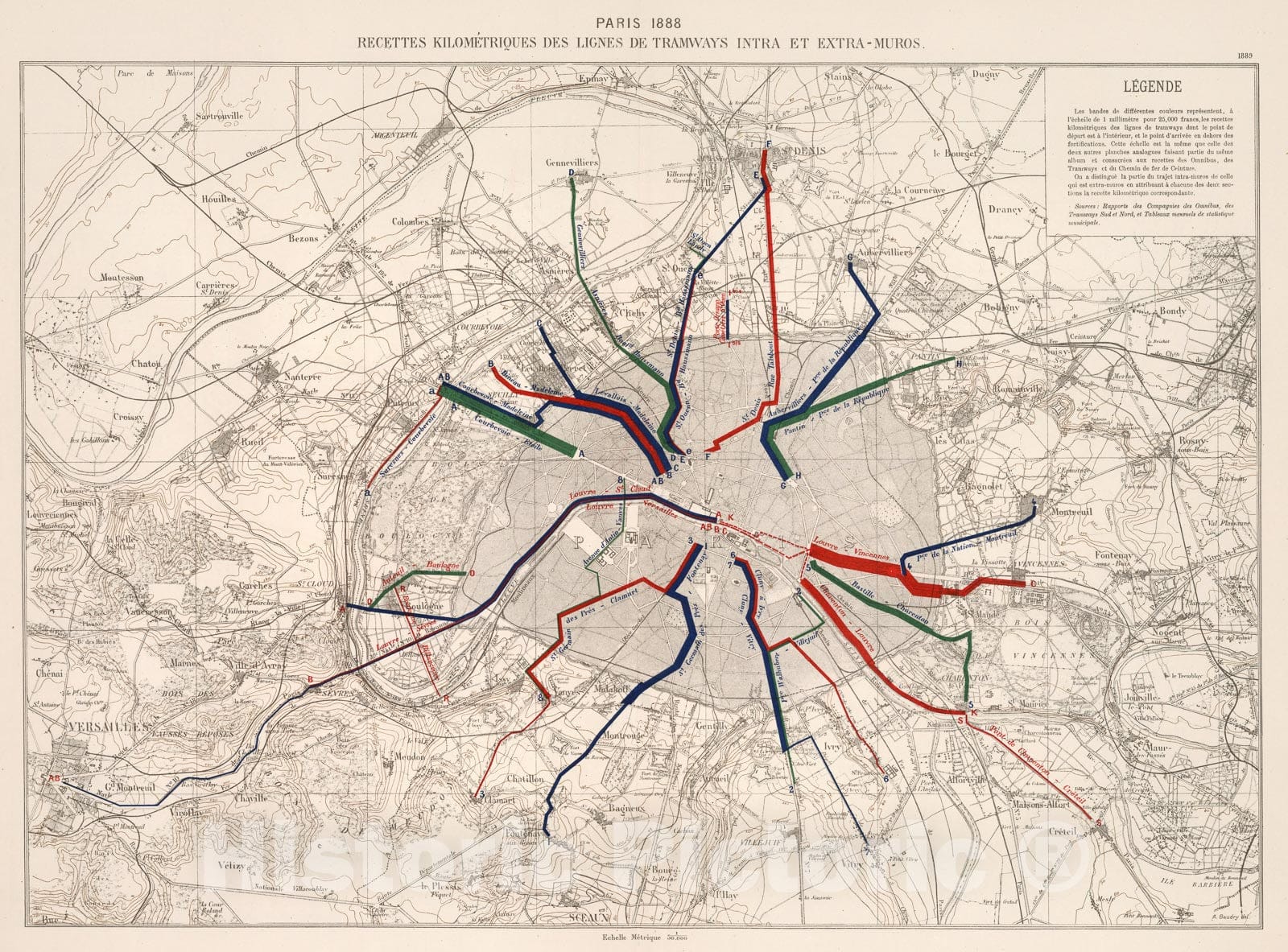 Historic Map : Paris 1888 : Recette kilometriques des ligns de tramways intra et extra - muros, 1889, Vintage Wall Decor