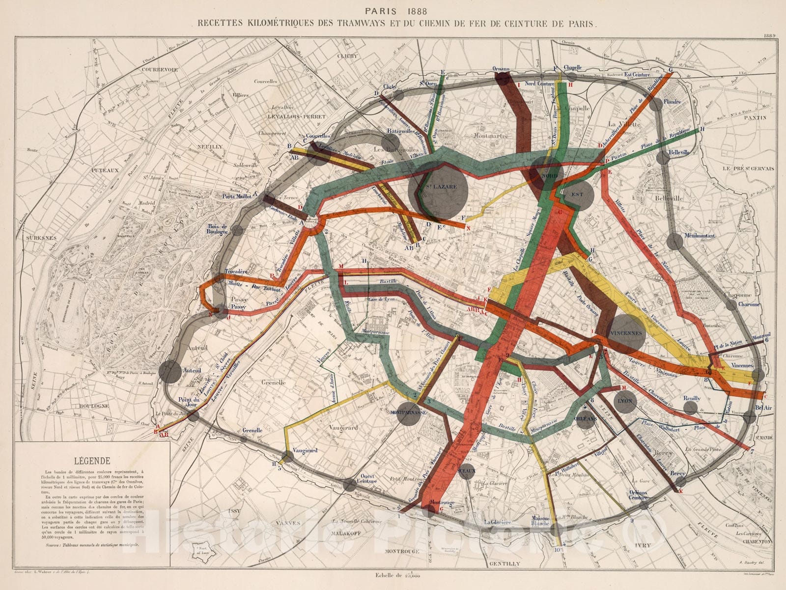 Historic Map : Paris 1888 : Recette kilometriques des tramways et chemin de fer de ceinture de Paris, 1889, Vintage Wall Decor