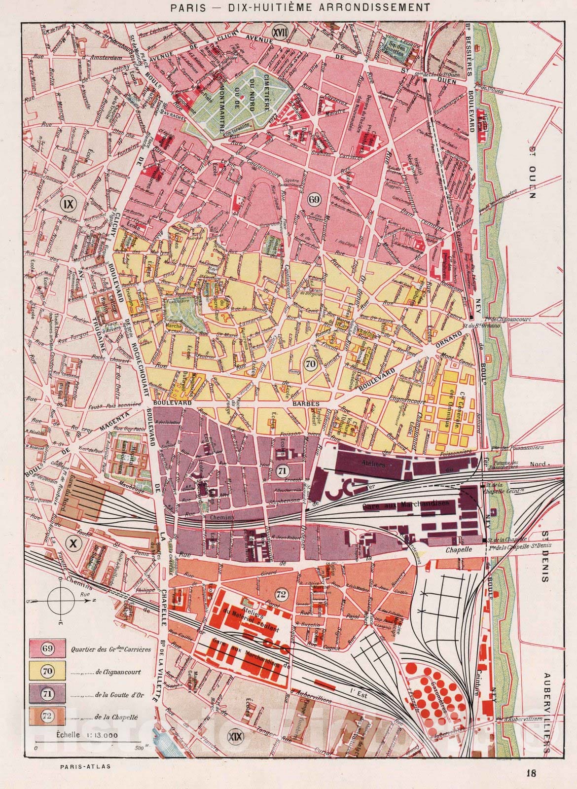 Paris - Dix-Huitieme Arrondissement. | Paris-Atlas. Texte par Fernand Bournon, Archiviste-Paleographe. 28 Cartes dont 24 en couleurs. 595 Reproductions photographques 32 Dessins. Libraire Larousse. Paris. | Color maps. In French. Available as a flip book at Internet Archive - Texts: https://archive.org/details/parisatlas00bour