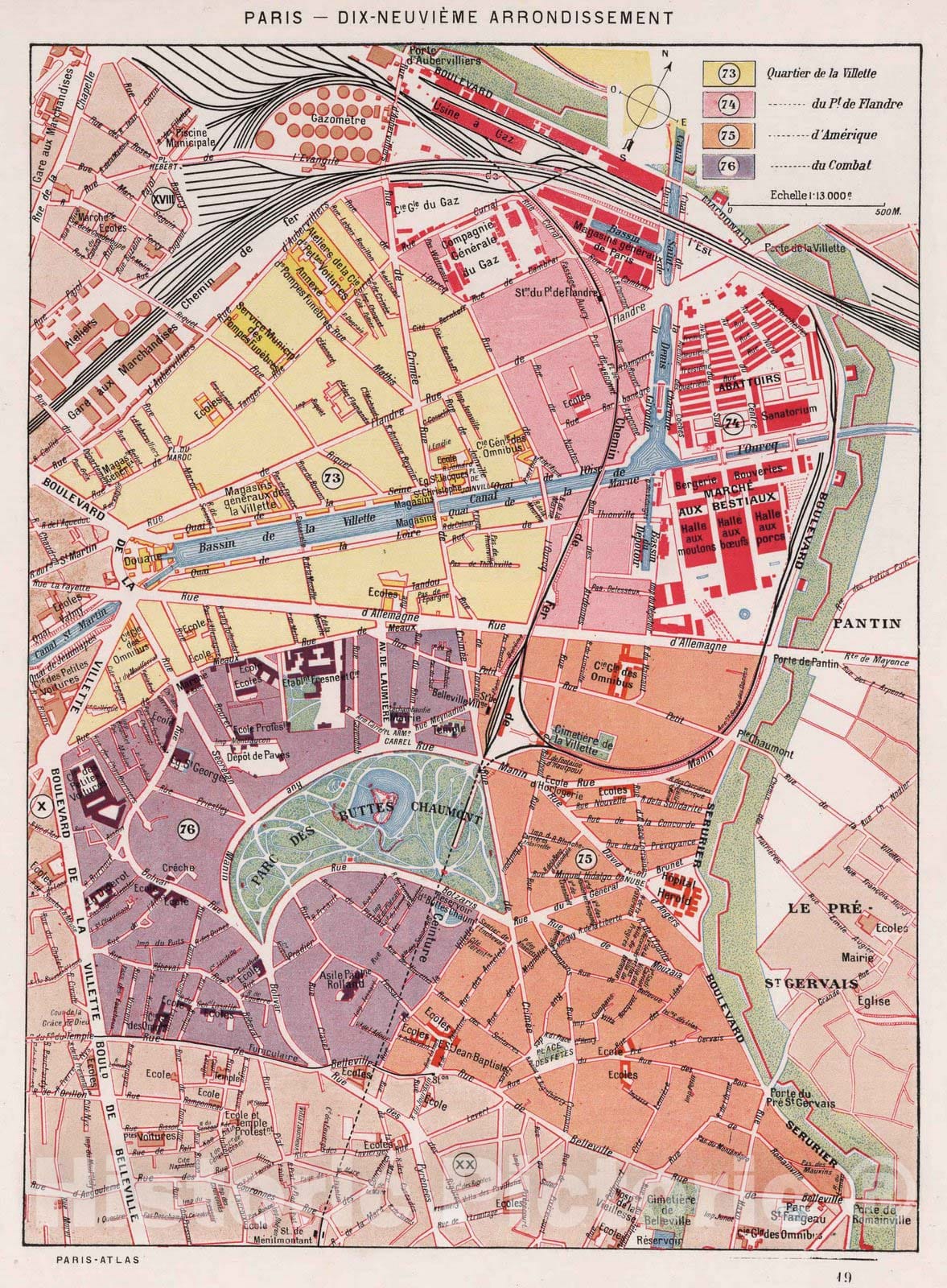 • .Historic Map : Paris , France, Paris (France), City Atlas Map, Paris - Dix-Neuvieme Arrondissement. 1900 , Vintage Wall Art