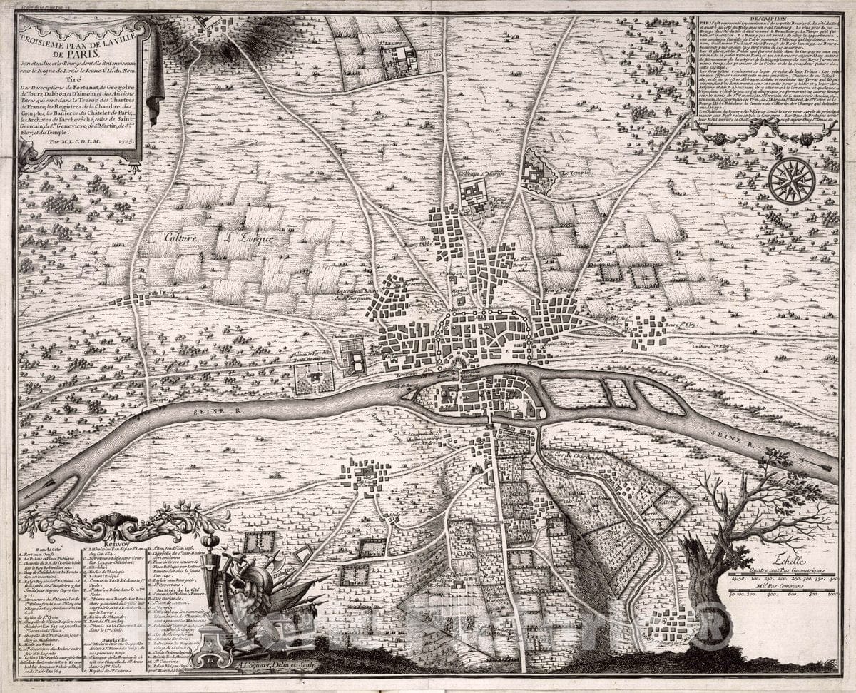 Historic Map : Paris , France, Troisieme Plan de La Ville de Paris, 1705 City Atlas , Vintage Wall Art