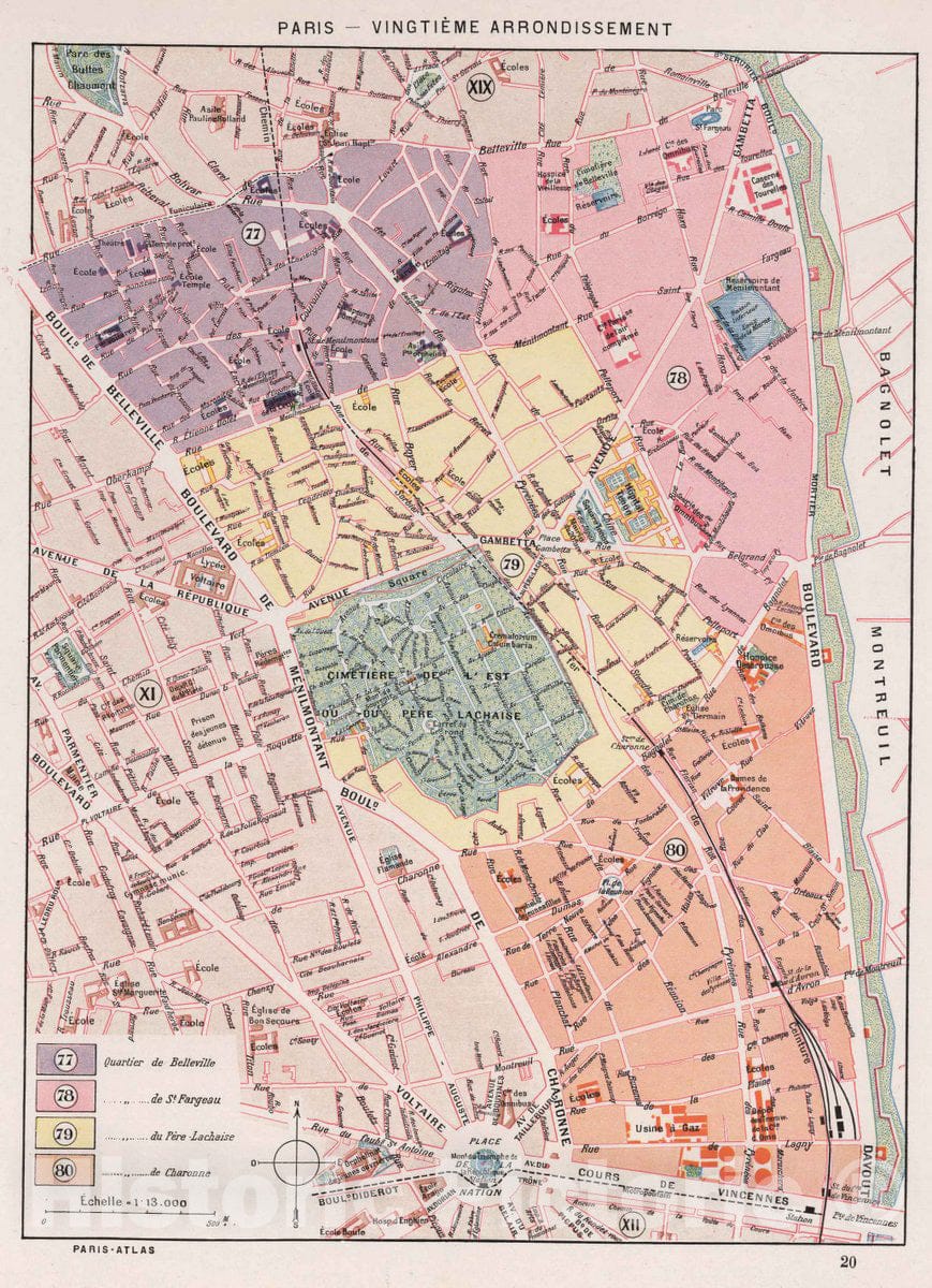 Historic Map : Paris , France, Paris - Vingtieme Arrondissement, 1900 City Atlas , Vintage Wall Art