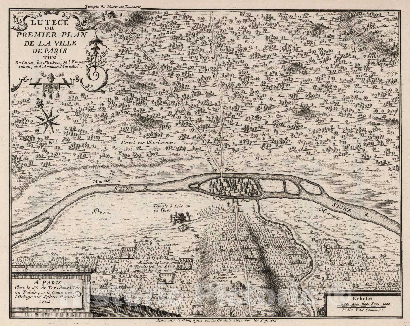 Historic Map : Paris , France,Premier Plan de La Ville de Paris tire de Cesar. 1714 , Vintage Wall Art