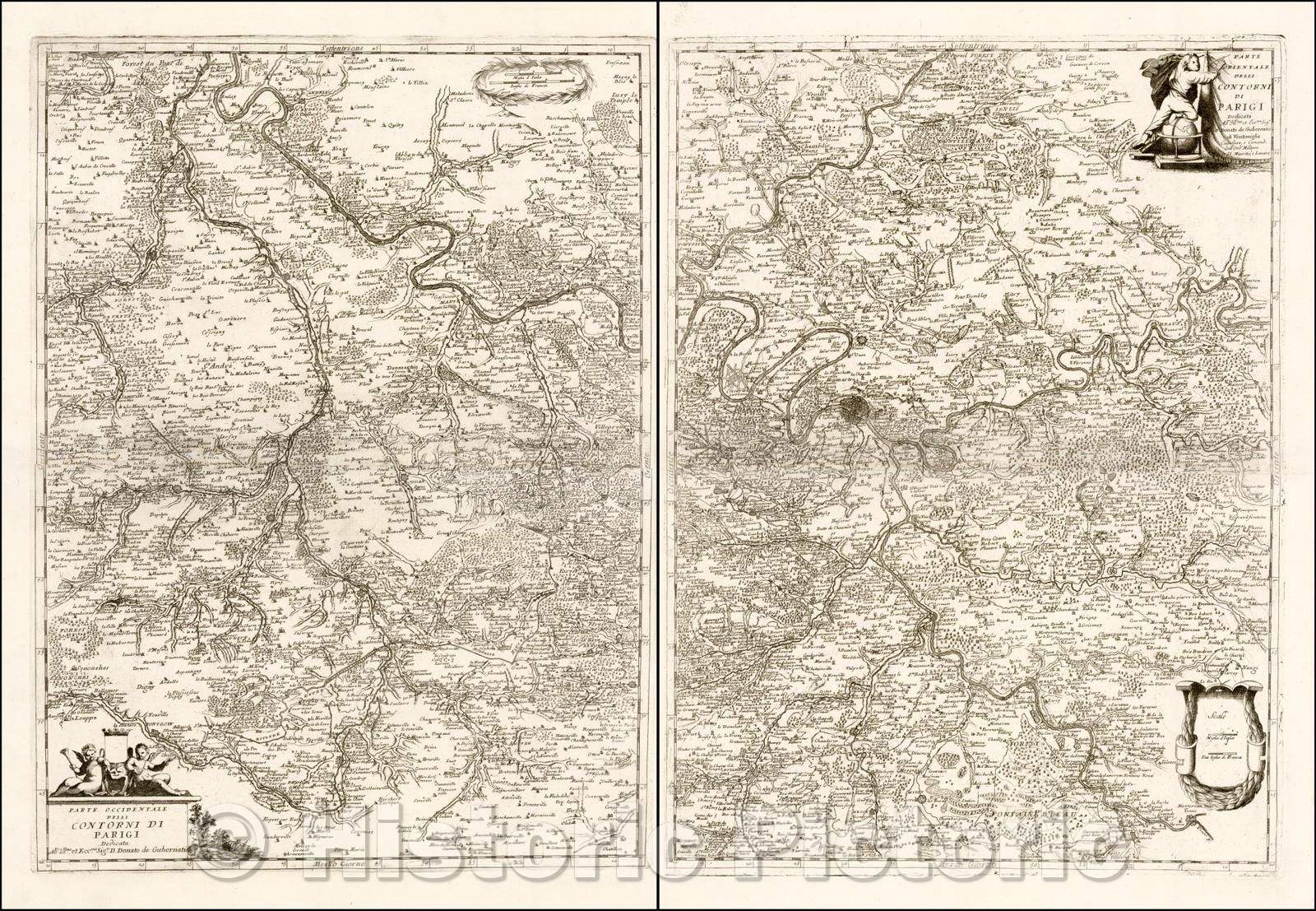 • .Historic Map - Parte Occidentale Delli Contorni Di Parigi (and) Parte Occidentale Delli Contorni Di Parigi/Western Delli Outlines Of Paris, 1690 - Vintage Wall Art