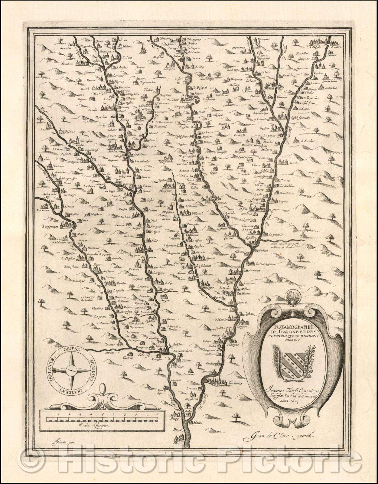 Historic Map - Potamographie de Garone et des Fleuves Qui Se Rendent :: Garonne Region, oriented with east at the top, Jean Le Clerc, in Paris, in 1628, 1628 - Vintage Wall Art