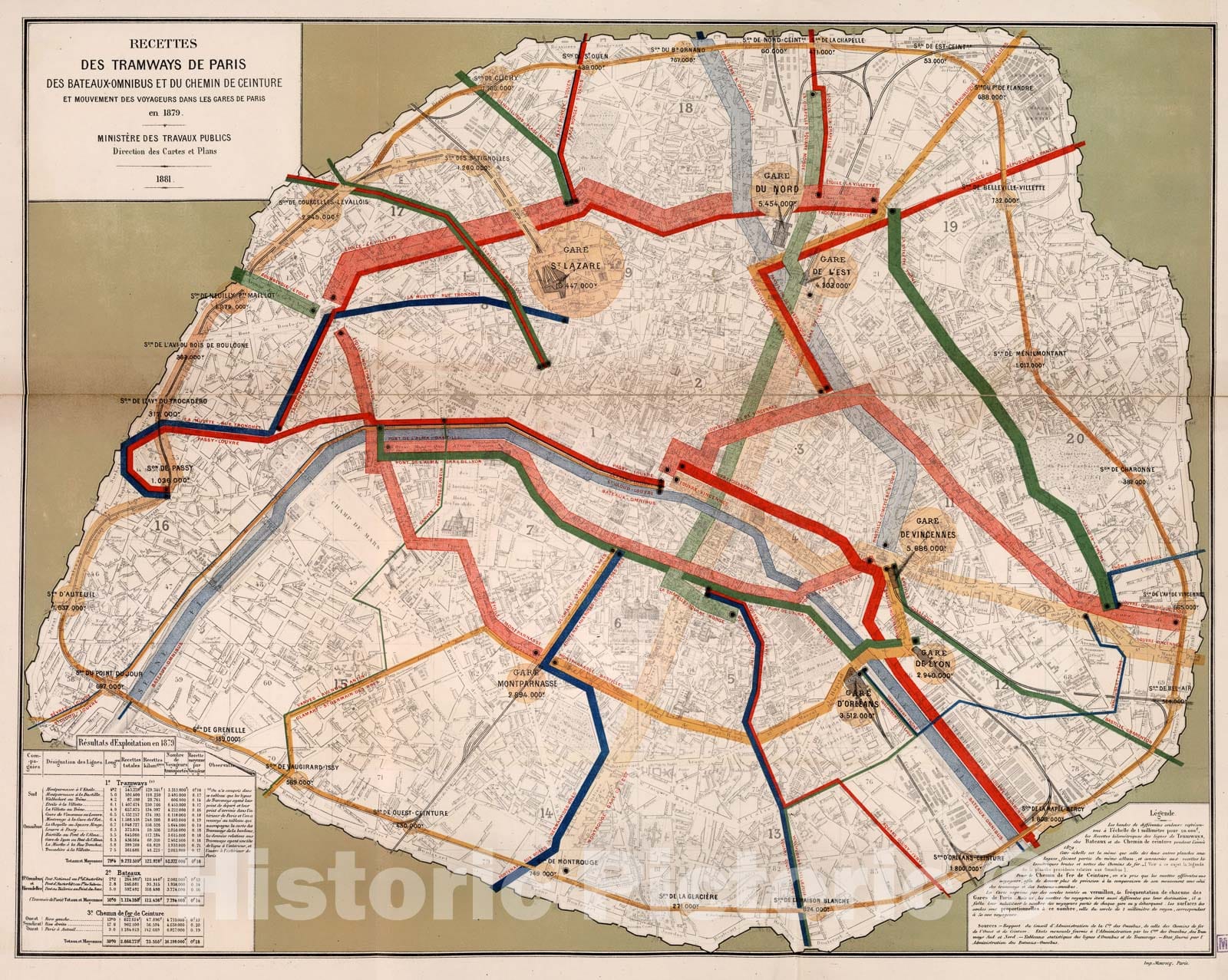Historic Map : Recettes des Tramways de Paris des Bateaux-Omnibus et Mouvement des Voyageurs, Paris en 1879., 1881, Vintage Wall Decor