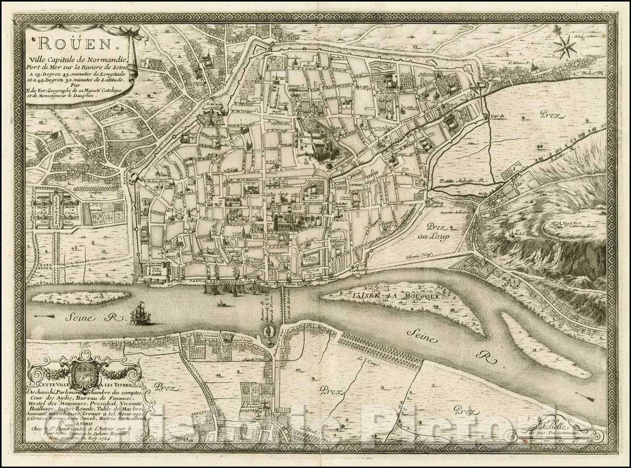 Historic Map - Rouen. Ville Capitale de Normandie, Port de Mer sur la Riviere Seine/Plan of the City of Rouen by Nicholas De Fer, published in Paris, 1724 - Vintage Wall Art