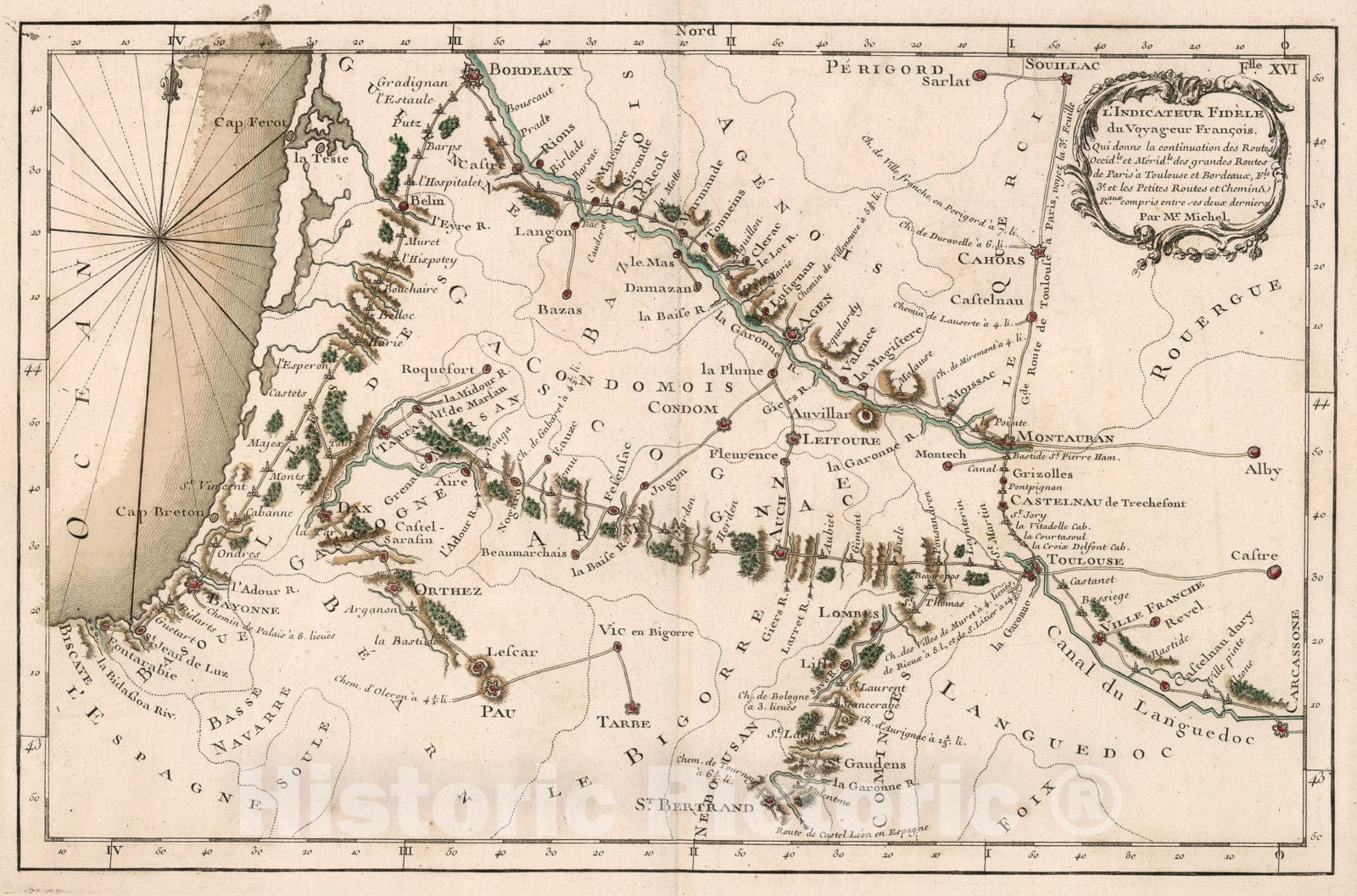 Historic Map : XVIe. Feuille. Qui donne la continuation des routes occid.le et merid.le des grandes routes de Paris a Toulouse et Bordeaux, 1765, Vintage Wall Decor