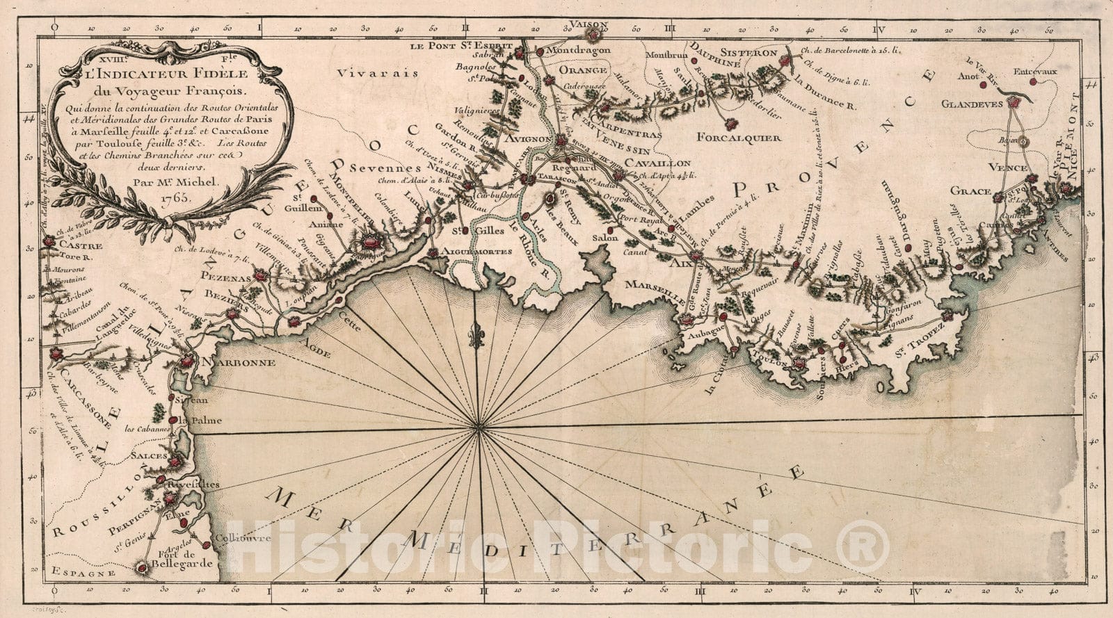 Historic Map : XVIIIe. Feuille. Qui donne la continuation des routes orientales et meridionales des grandes routes de Paris a? Marseille, 1765, Vintage Wall Decor