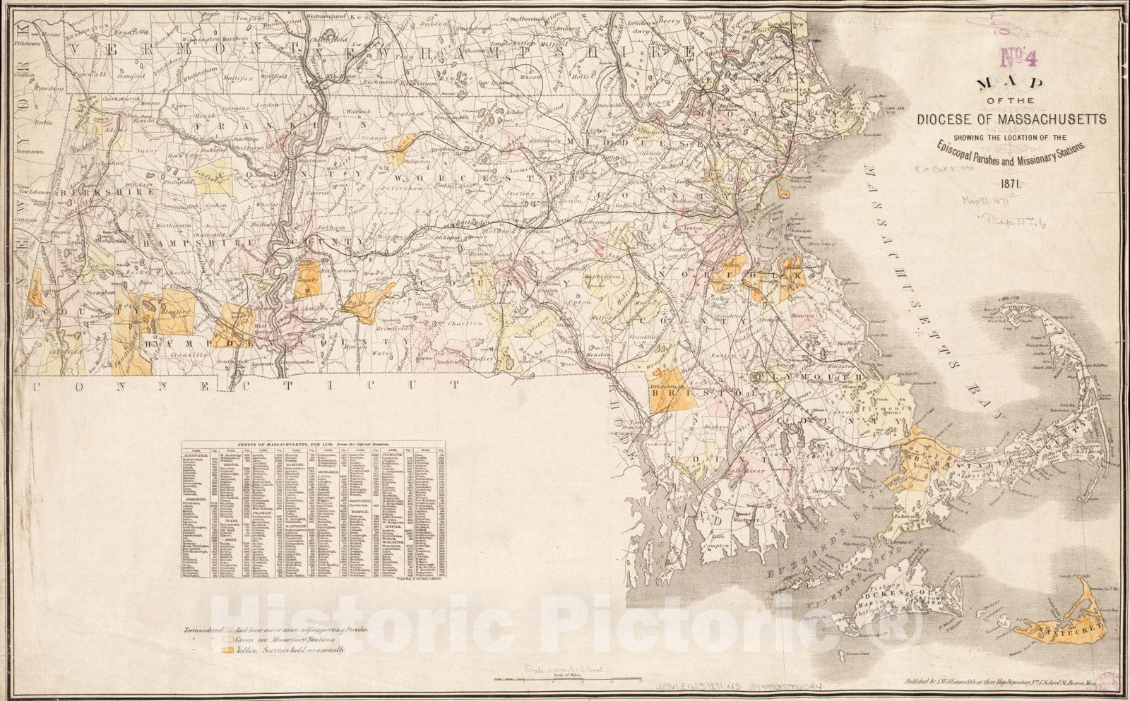 Historical Map, 1871 Map of The Diocese of Massachusetts Showing The Location of The Episcopal parishes and Missionary Stations, Vintage Wall Art
