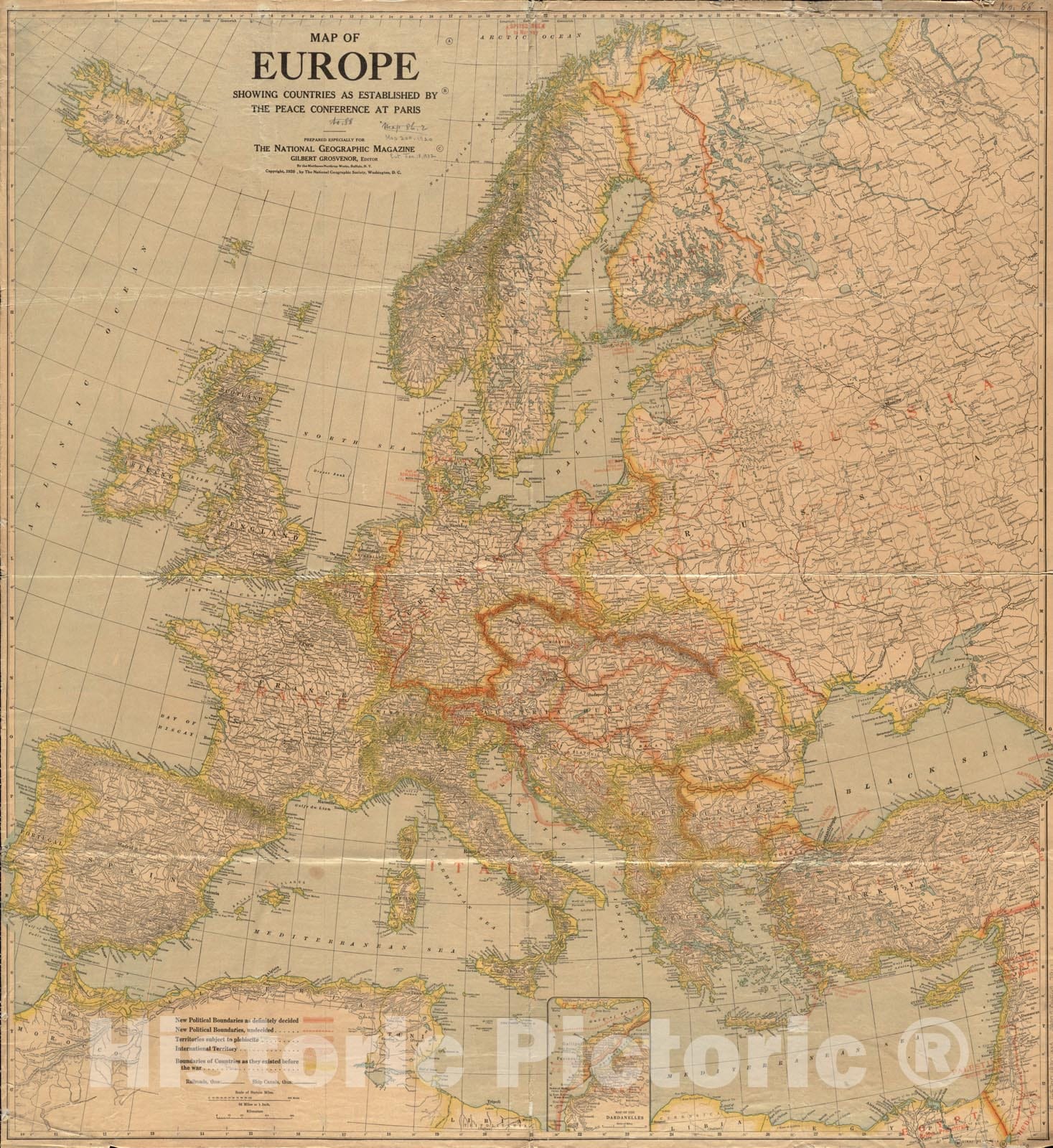 • Historical Map, 1920 Map of Europe Showing Countries as Established by The Peace Conference at Paris, Vintage Wall Art
