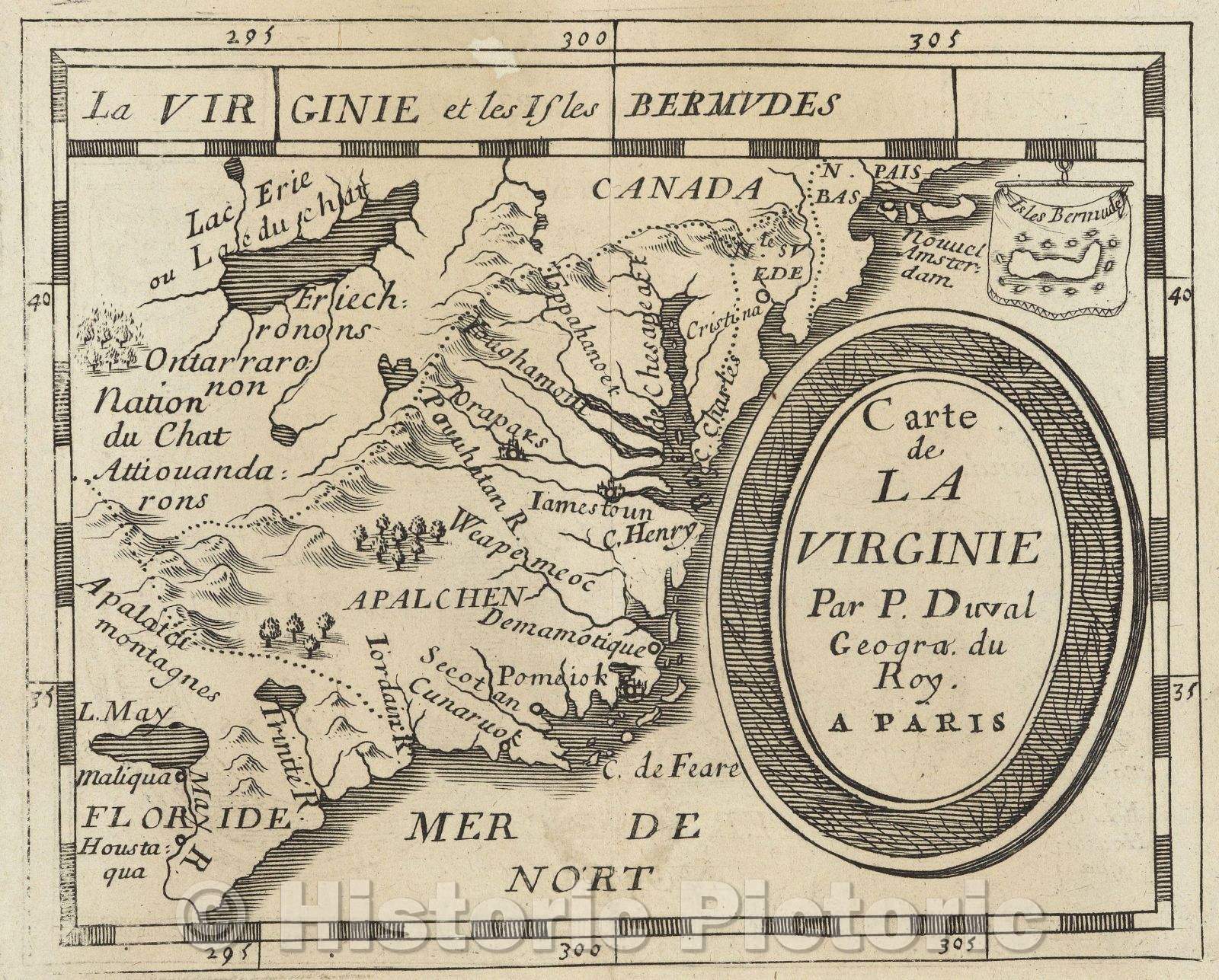 • Historic Map : Carte de la Virginie par P. Duval Geogra. du Roy. A Paris, 1670 , Vintage Wall Art