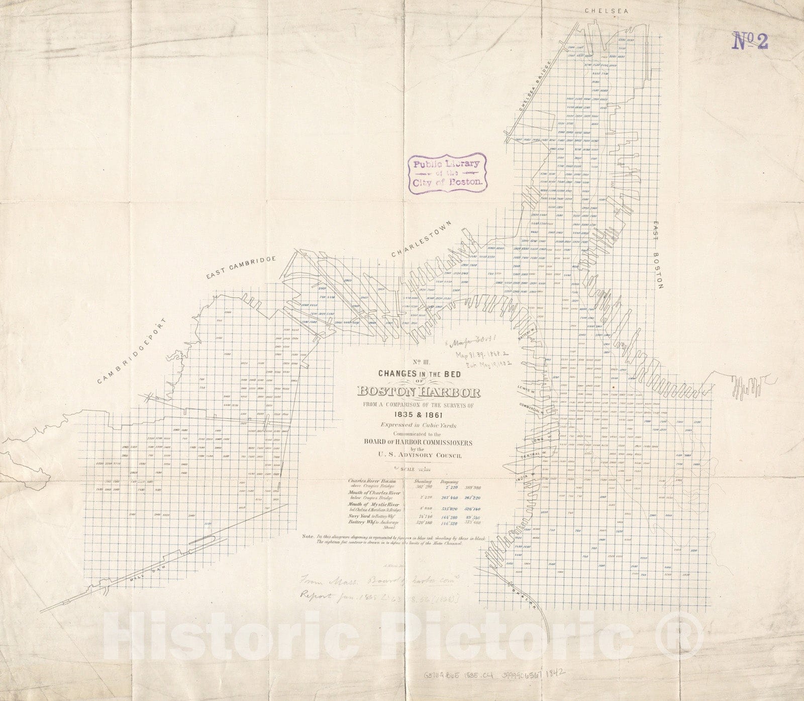 Historical Map, Changes in The Bed of Boston Harbor, from a Comparison of The surveys of 1835 & 1861, Vintage Wall Art