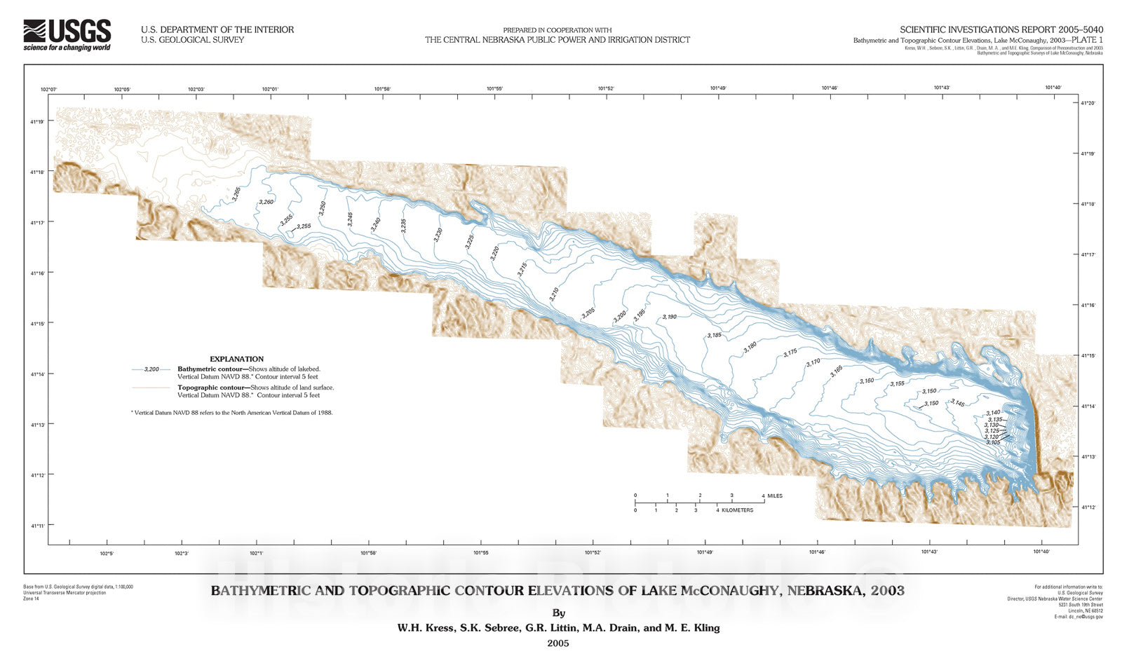 Map : Comparison of preconstruction and 2003 bathymetric and topographic surveys of Lake McConaughy, Nebraska, 2005 Cartography Wall Art :