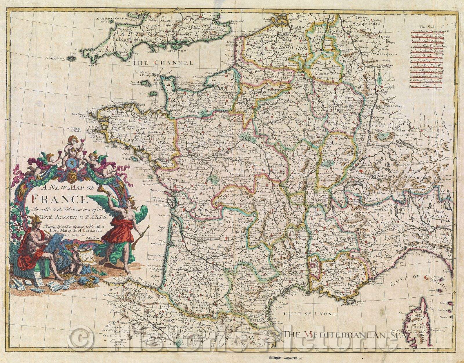 Historic Map : A New Map of France Agreeable to the Observations of the Royal Academy at Paris Humbly Inscrib'd to the most Noble John, Lord Marquis of Carnarvon, 1721 , Vintage Wall Art
