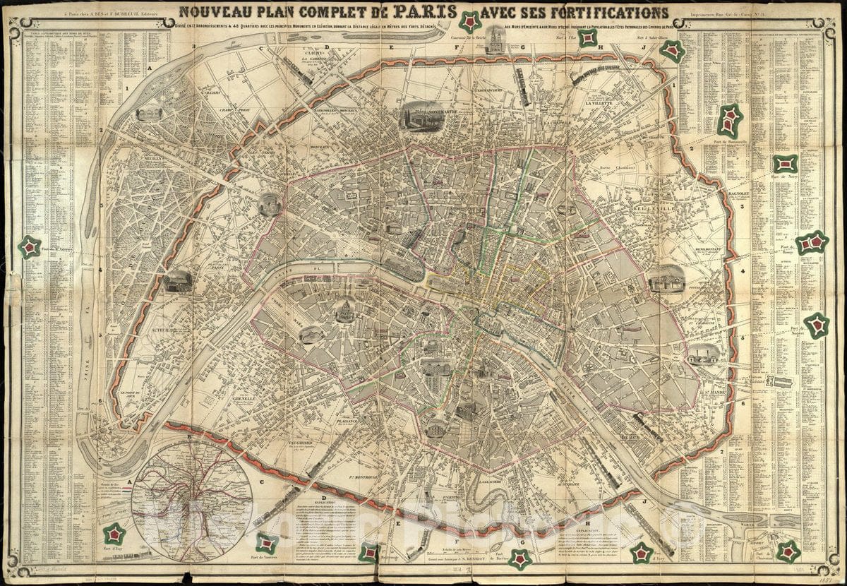 Nouveau plan complet de Paris avec ses fortifications : divise en 12 arrondissements & 48 sections avec les principaux monuments en elevation, donnant la distance legale en metres des forts detaches aux murs d'enceinte & aux murs d'octroi indiquant la
