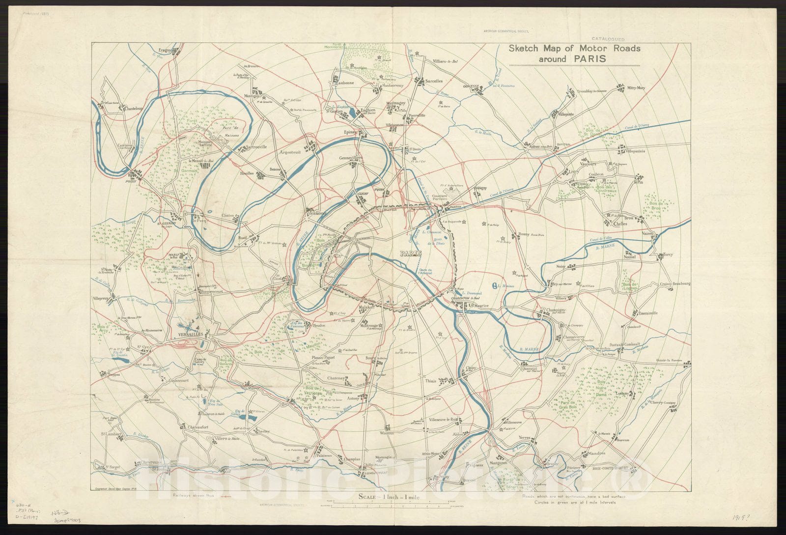 Map : Paris, France 1919, Sketch map of motor roads around Paris, Antique Vintage Reproduction