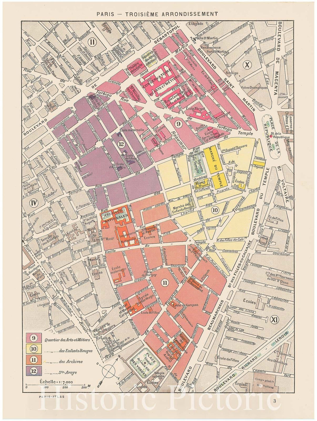 Historic Map : Europe, Paris 1900 3rd Arrondissement , Vintage Wall Art