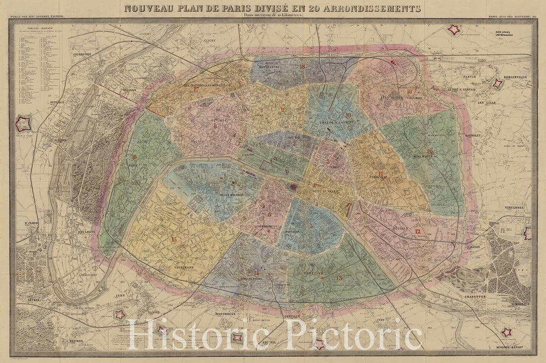 Map : Paris, France 1871, Nouveau plan de Paris divise en 20 arrondissements : dans un rayon de 10 kilometres , Antique Vintage Reproduction
