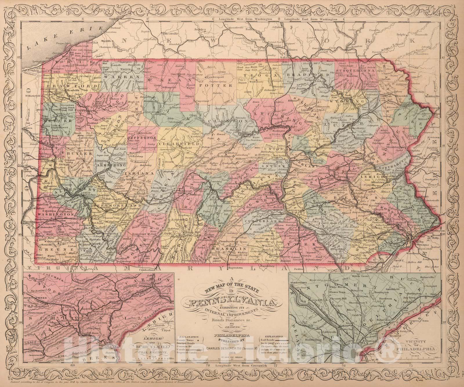 Historic Map : A New Map of the state of Pennsylvania : Published by Charles Desilver, 1859 - Vintage Wall Art
