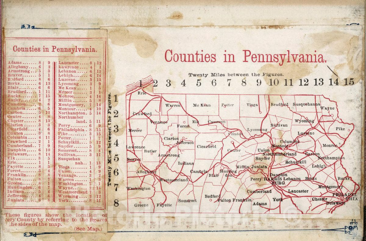 • .Historic Wall Map : Counties in Pennsylvania. Larrance's Post Office Chart, and maps of Ten States, 1866 Atlas - Vintage Wall Art