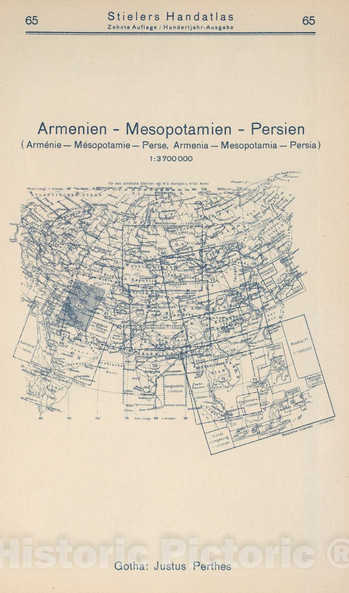 (Index Map) 65. Armenien - Mesopotamien - Persien. Armenia - Mesopotamia - Persia. | Stieler's Atlas of Modern Geography. 254 Maps & Insets on 108 Sheets Engraved on Copper. Tenth (Centenary) Edition. Completely Revised & Largely Redrawn under the Direction of Professor H. Haack in Justus Perthes' Geogr. Institute. (in two parts). 1925. Gotha: Justus Perthes. | Publisher:Justus Perthes
