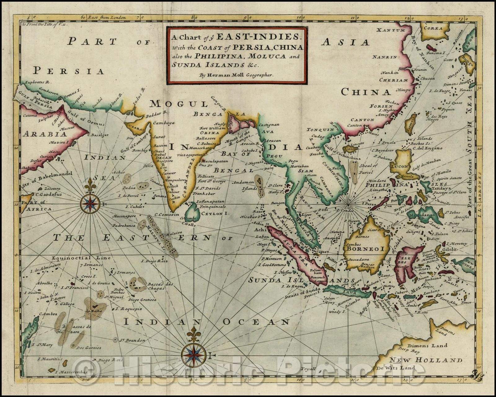 • .Historic Map - A Chart of ye East-Indies. With the Coast of Persia, China also the Philipina, Moluca and Sunda Islands, 1745, Herman Moll v1