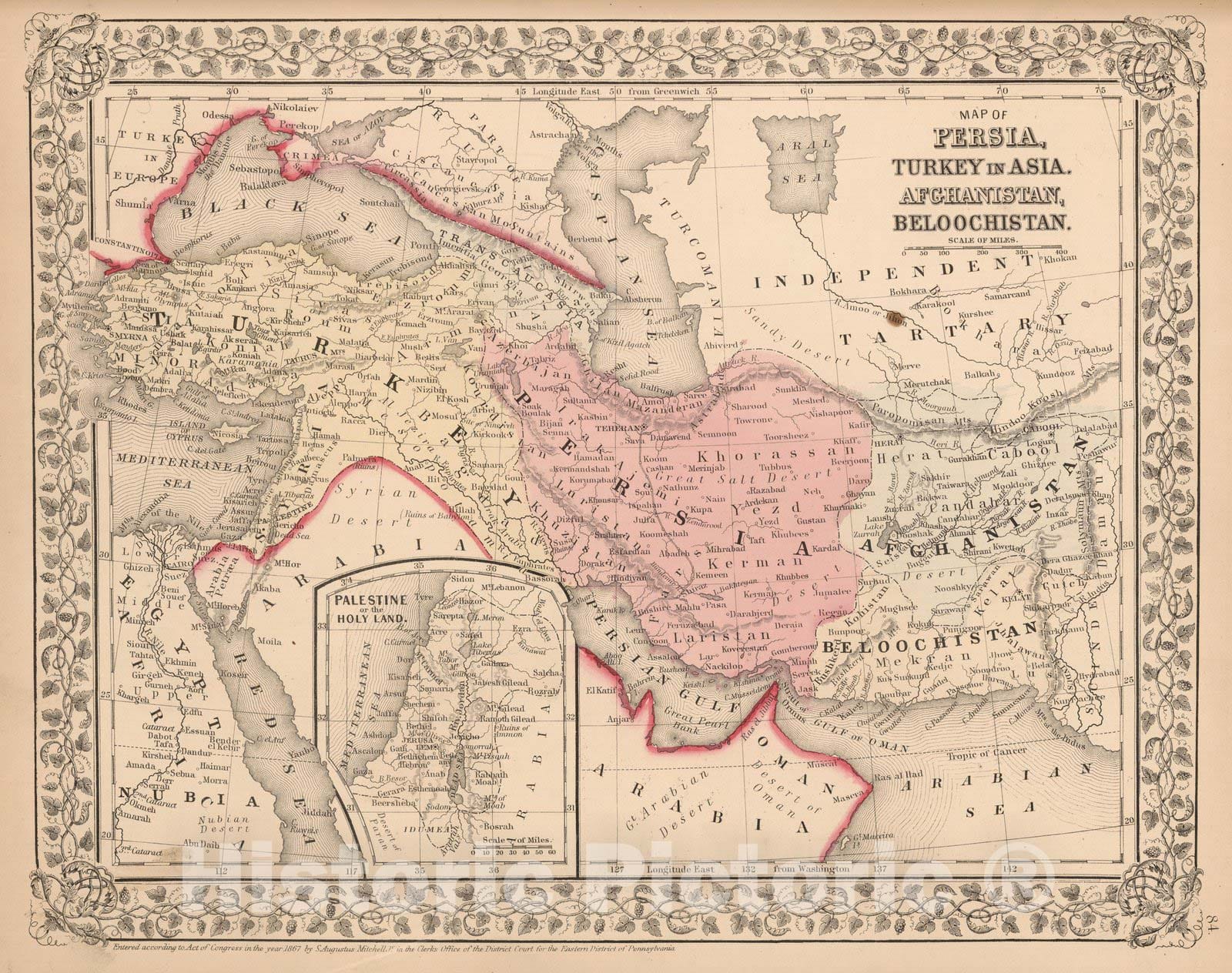 • .Historic Map - Map of Persia, Turkey in Asia, Afghanistan, Beloochistan, 1863, Samuel Augustus Mitchell Jr. - Vintage Wall Art