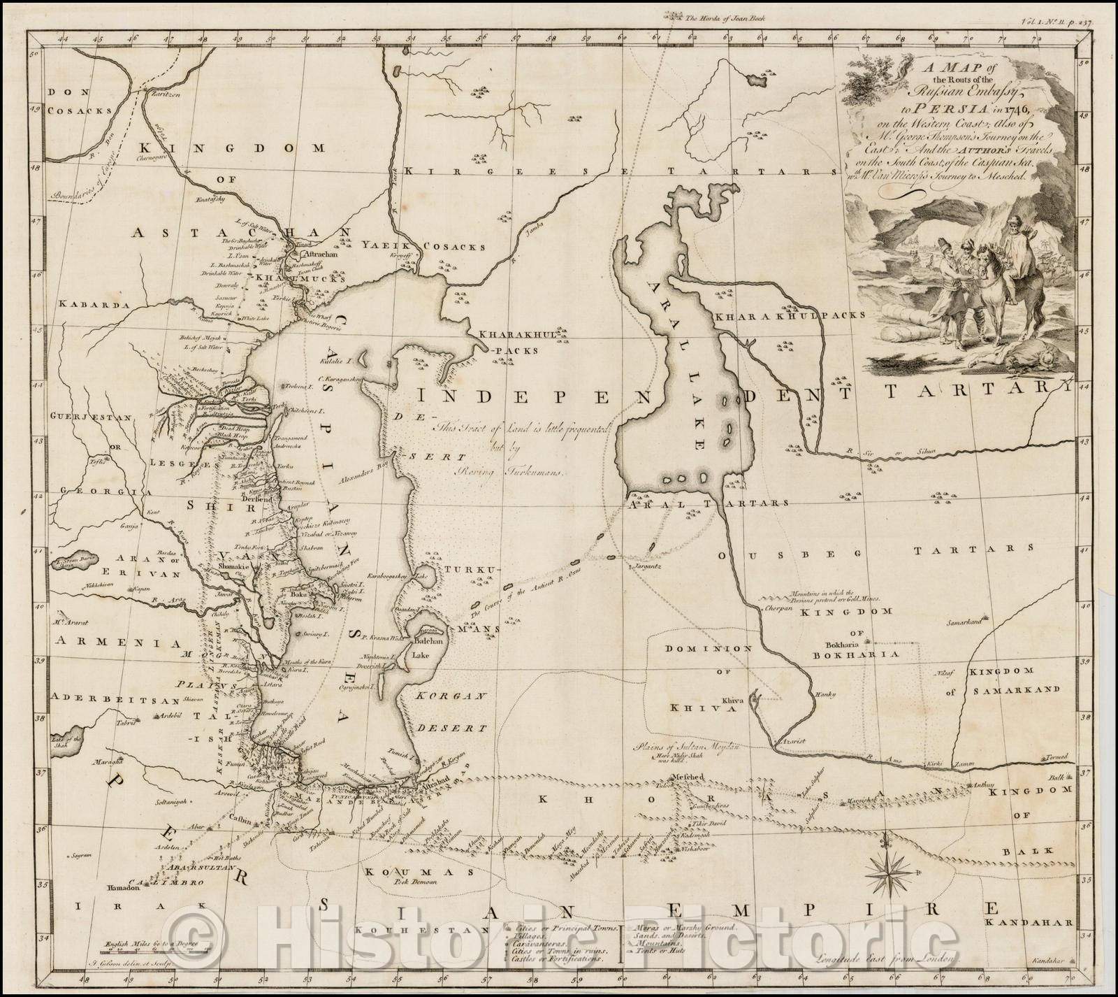 Historic Map - Routs of the Russian Embassy to Persia in 1746, on the Western Coast; Also of Mr. George Thompson's Journey in the East; And the Author', 1753 - Vintage Wall Art