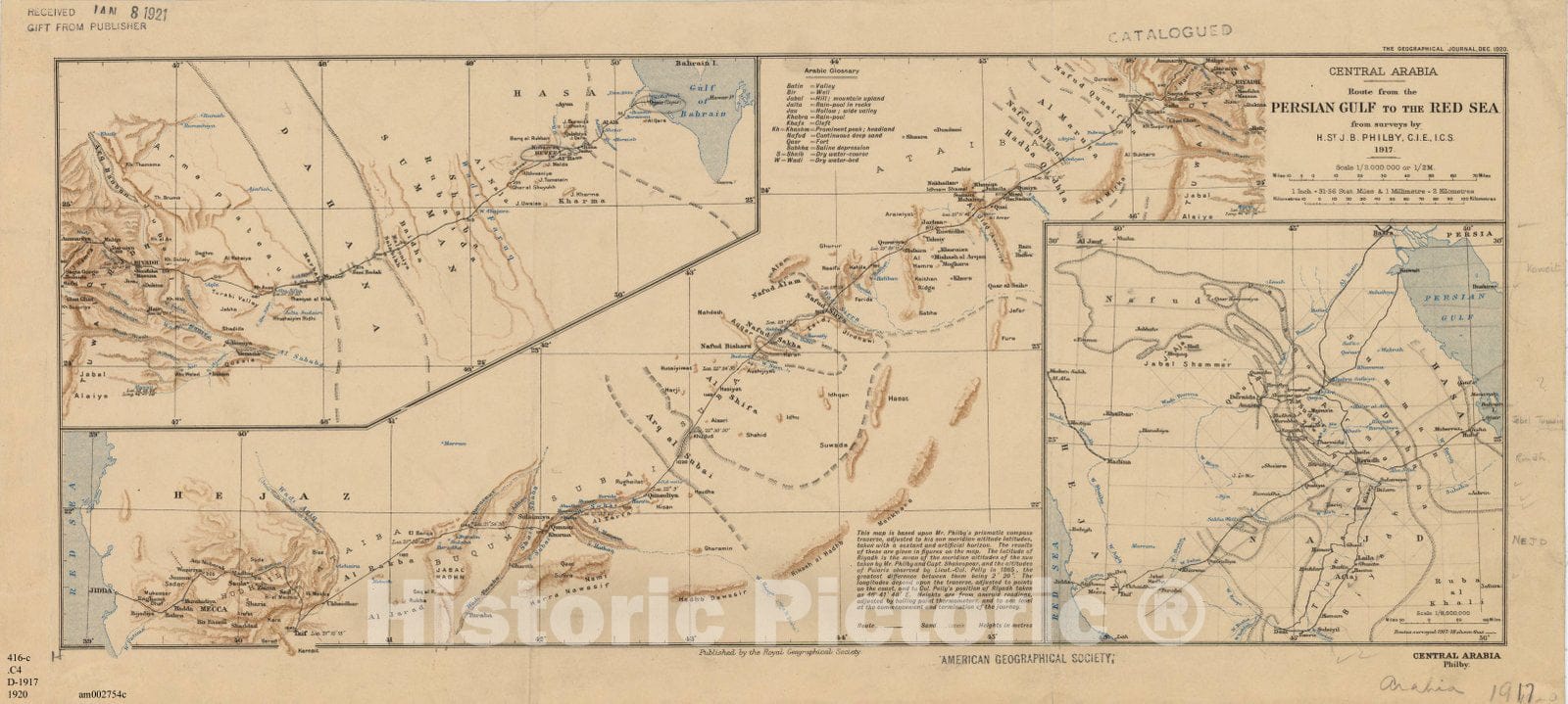 Central Arabia : route from the Persian Gulf to the Red Sea from surveys by H. St. J.B. Philby ... 1917 / published by the Royal Geographical Society.