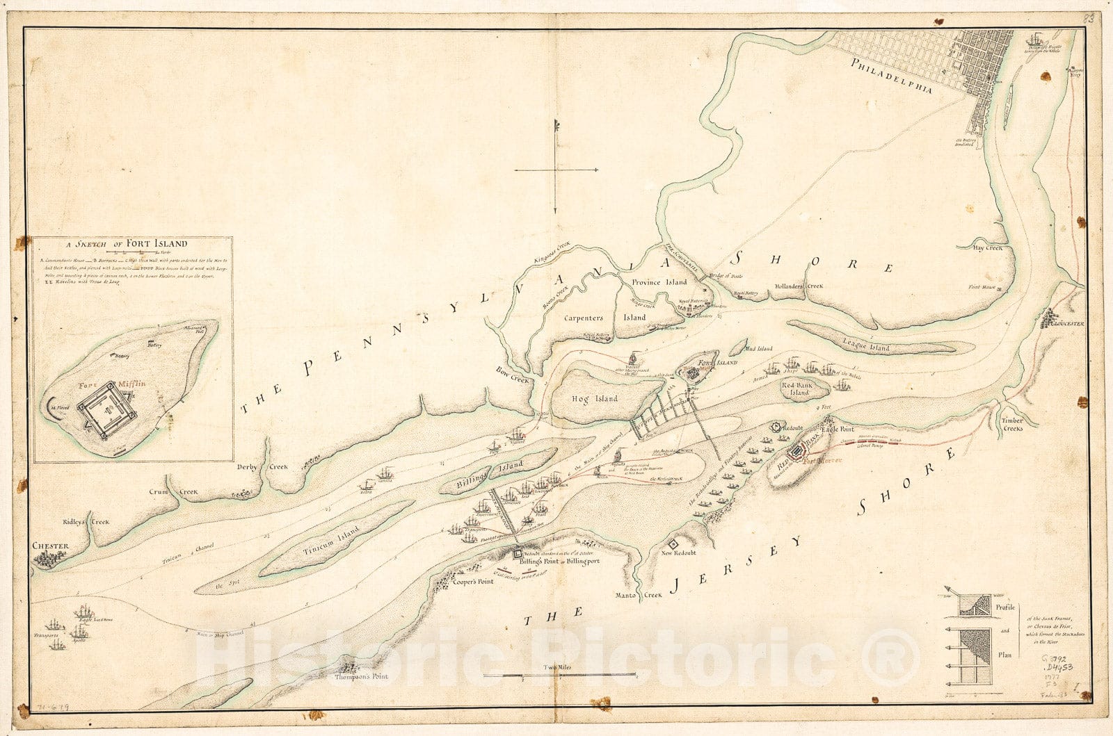 Historic 1777 Map - The Course of Delaware River from Philadelphia to Chester, exhibiting The Several Works erected by The Rebels to Defend its Passage