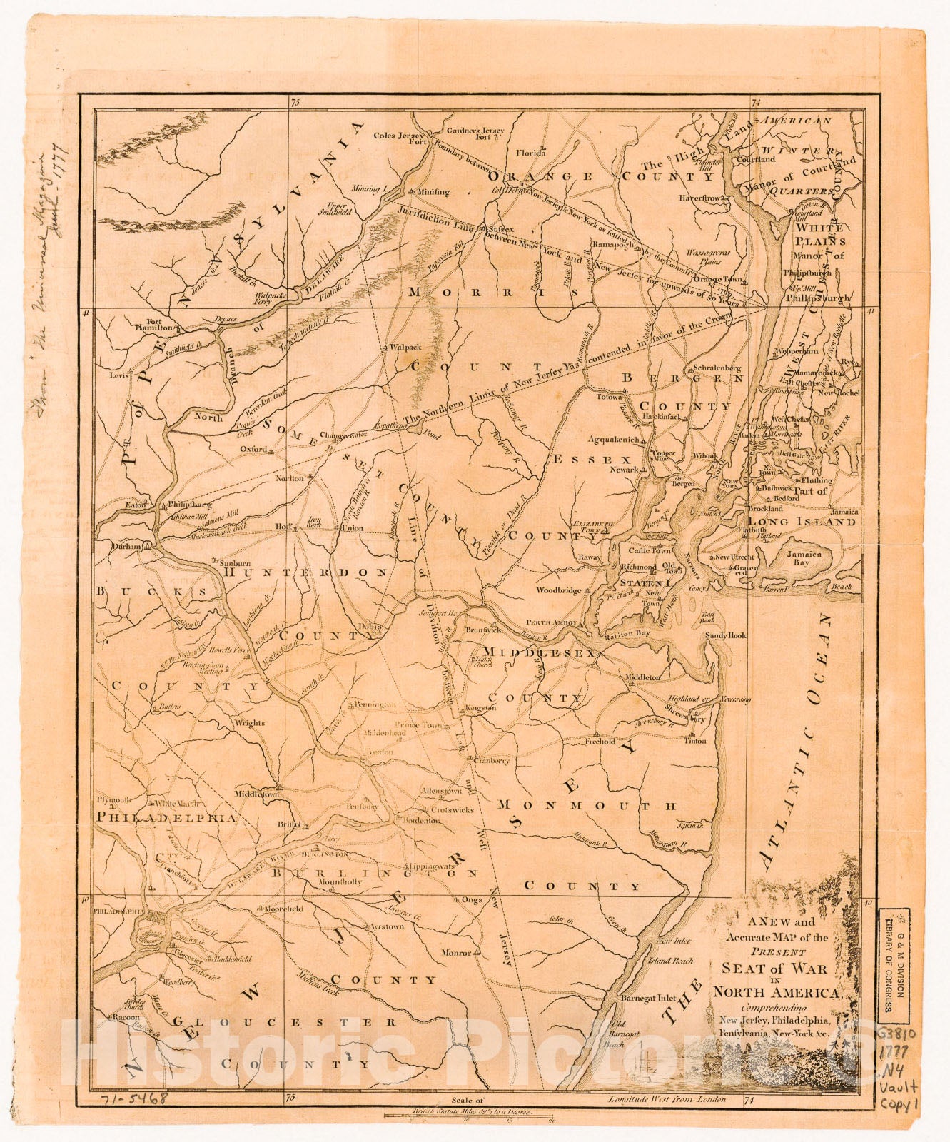Historic 1777 Map - A New and Accurate map of The Present seat of war in North America, comprehending New Jersey, Philadelphia, Pensylvania, New-York, c.
