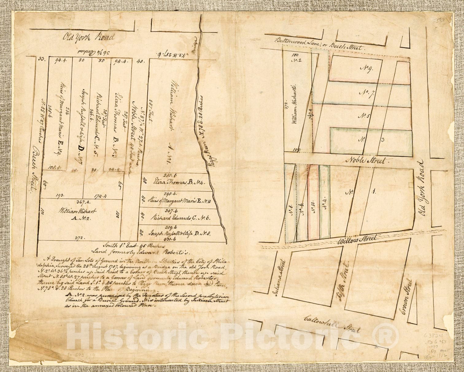 Historic 1787 Map - A Draught of Ten Lots of Ground in The Northern Liberties of The City of Philadelphia, surveyed The 28th August 1787, Beginning at a Bridge on The Old York Road